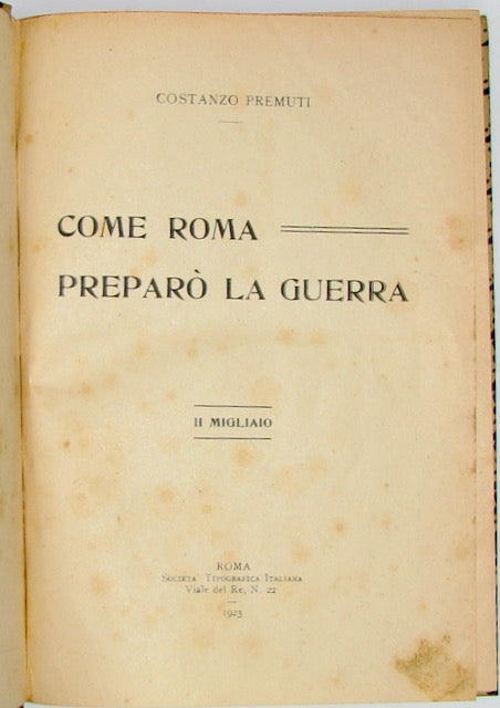 Premuti, Costanzo. Come Roma Preparo La Guerra; Il Migliaio. Roma: Societa Tipografica Italiana, 1923. 1st Edition. [881]