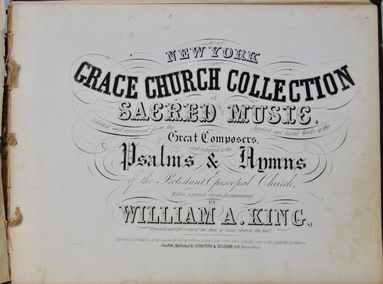 King, William A. New York Grace Church Collection of Sacred Music, selected and arranged from the Classical and Sacred Works of the Great Composers, and adapted to the Psalms & Hymns of the Protestant Episcopal Church, With a separate Organ Accompaniment. New York: Standord & Delisser, 1852. First Edition. [11641]