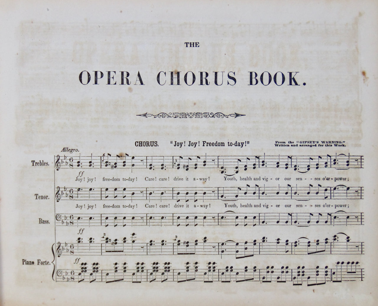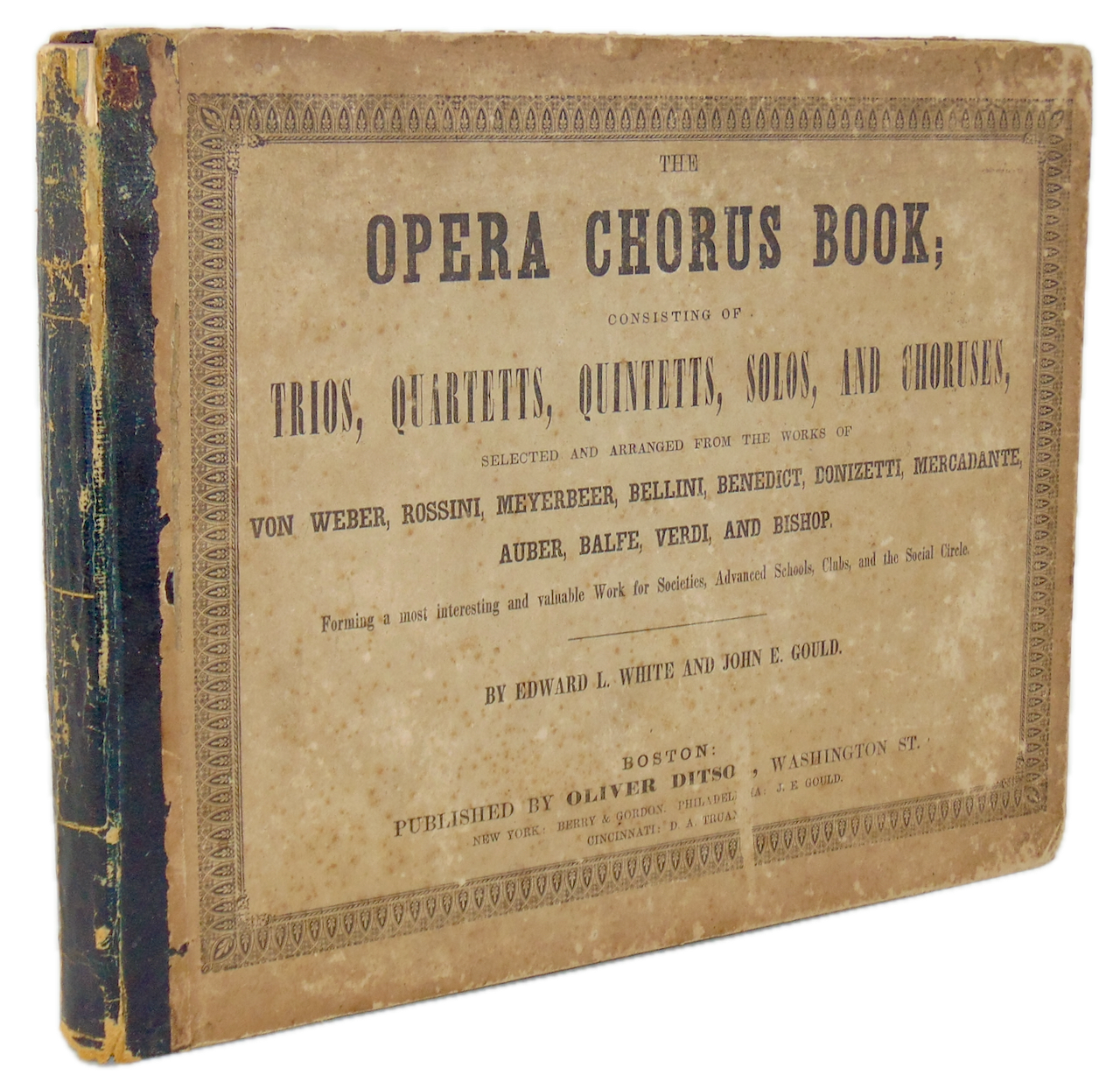 White, Edward L.; Gould, John E. The Opera Chorus Book ; consisting of Trios, Quartetts, Qintetts, Solos, and Choruses, selected and arranged from the works of Von Weber, Rossini, Meyerbeer, Bellini, Benedict, Donizetti, Mercandante, Auber, Balfe, Verdi, and Bishop. Forming a most interesting and valuable Work for Societies, Advanced Schools, Clubs, and the Social Circle. Boston: Oliver Ditson, 1847. First Edition. [11640]