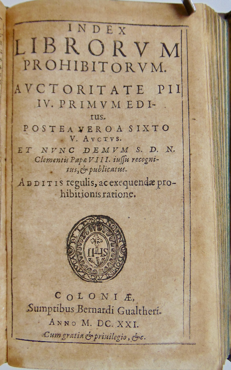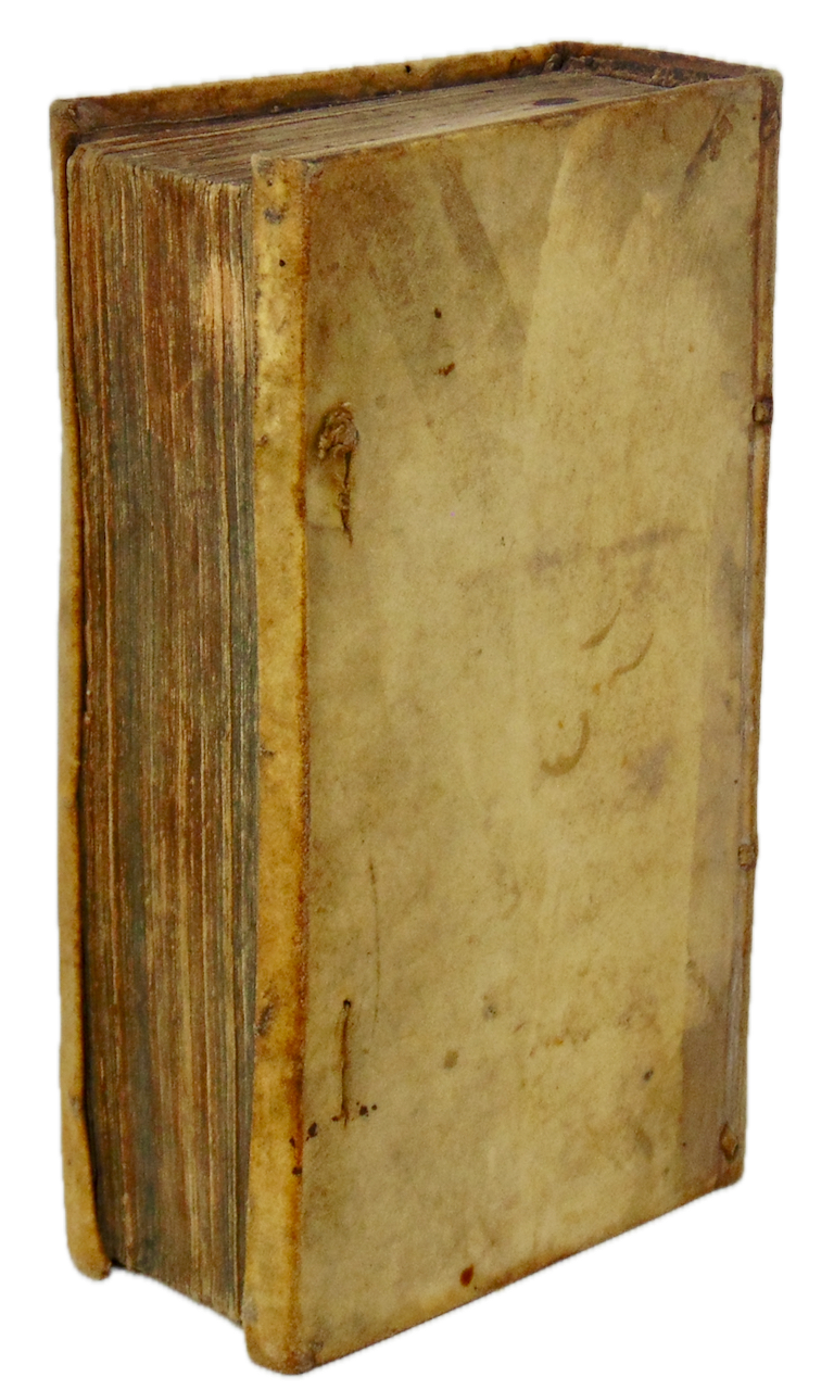 Full vellum binding, yapped edges, soiled, remnants of paper spine label, lacks the tie closures. 13.3 x 8 cm, (5 1/4 x 3 inches). viii, 459, v; 123, [1]; [22] pp. Text is collated and complete; leaves are toned; several mistakes in page numbers of the first book but the text itself is complete and in the right order. Bordered in black with a column to the side for printed Scripture and other references. Separate title page for the Index Librorvm Prohibitorvm, Coloniae, Bernardi Gualtheri, 1621. This has v. preliminary pages and 123 pages of text, a final blank page. The text of the Index has some light foxing & stains. Emblem of the Society of Jesus on both title pages. The last 22 unnumbered pages are Ordo Sev Methodvs brevis et facilis Legendi decreta Reformationis, Concilii Tridentini. Very good. Hardcover.