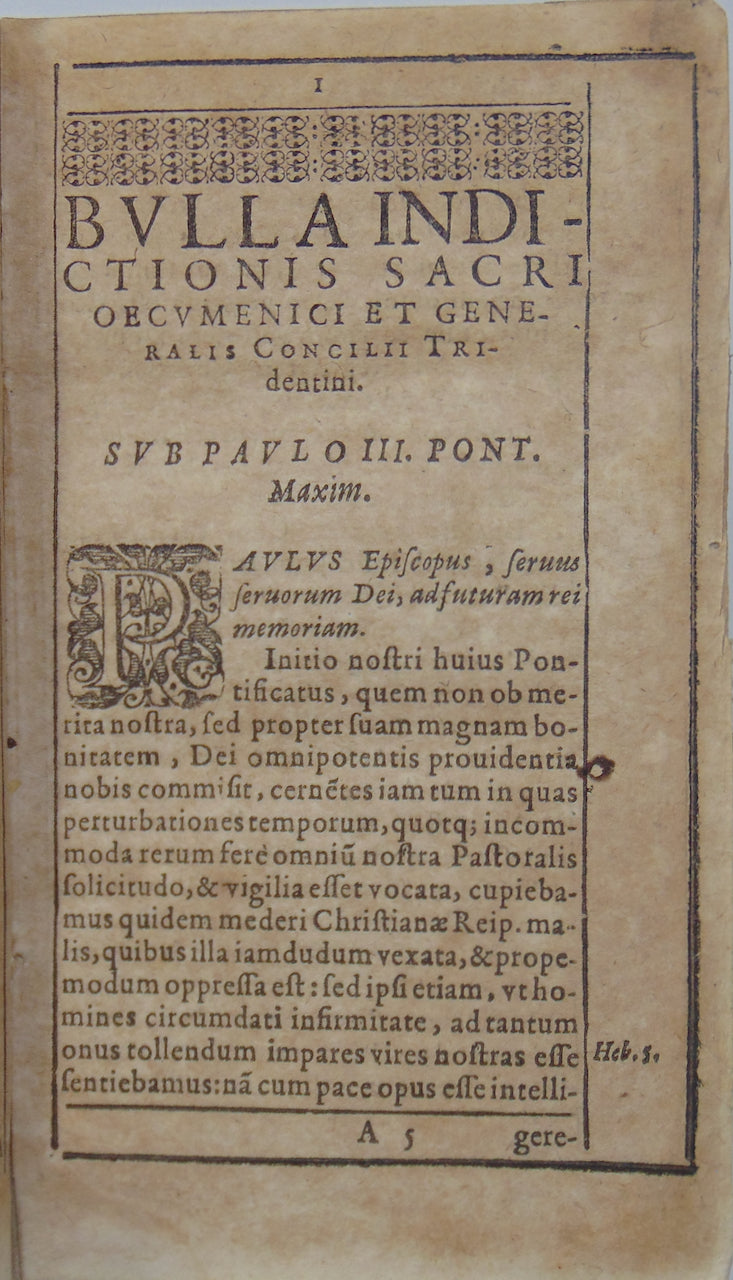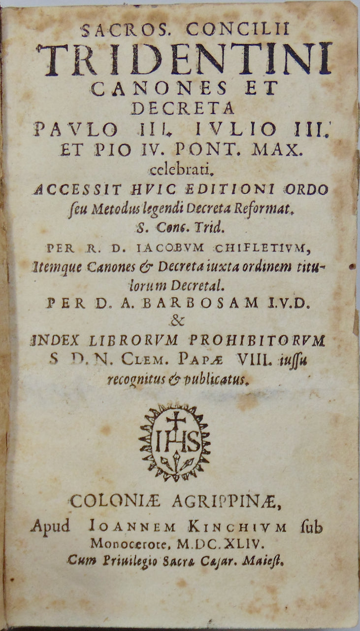 Concilium Tridentinum. SACROS. CONCILII TRIDENTINI CANONES ET DECRETA PAVLO III. IVLIO III. ET PIO IV. PONT. MAX. celebrati. ACCESSIT HVIC EDITIONI ORDO seu Metodus legendi Decreta Reformat. S. Conc. Trid. PER R. D. IACOBVM CHIFLETIVM, Itemque Canones & Decreta iuxta ordinem titulorum Decretæl. PER D. A. BARBOSAM I. V. D. & INDEX LIBRORVM PROHIBITORVM S D. N. CLEM. PAPÆ VIII. iussu recognitus & publicatus. Coloniae Agrippinae [Cologne]: Apud Ioannem Kinchivm sub Monocerote, 1644. Cum Privilegio Sacra Casar. Maiest. [11692]