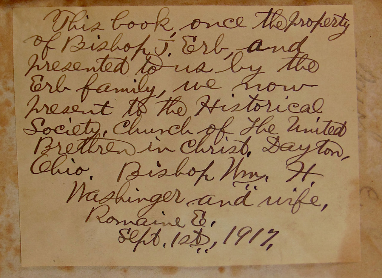Brown leather spine & corners marbled boards, binding quite scuffed with some small worming yet with very good tight joints, black leather spine title label with chipped edges, 8 1/2 x 5 1/2 inches. Manuscript note tipped in at front: "This book once the property of Bishop J. Erb, and presented to us by the Erb family, we now present it to the Historical Society, Church of the United Brethren in Christ, Dayton, Ohio. Bishop Wm. H. Washinger and wife, Romaine E., Sept 1st, 1917." Purchased by us from a dealer in central New York. xxix, 508 pp., 3 pp. list of subscriber's names. Generally clean pp., infrequent foxing, tight. Good. Hardcover.