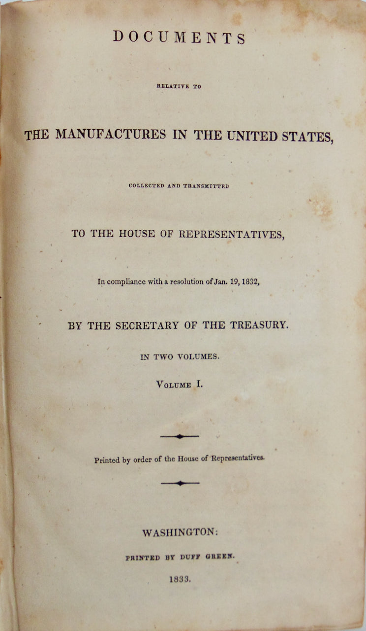 Clapp, Asa; Child, James L.; et al. Documents relative to the Manufactures in the United States (2 volume set) collected and transmitted to the House of Representatives, In compliance with a resolution of Jan. 19, 1832, by the Secretary of the Treasury. Washington: Printed by Duff Green, 1833. First Edition. [11793]