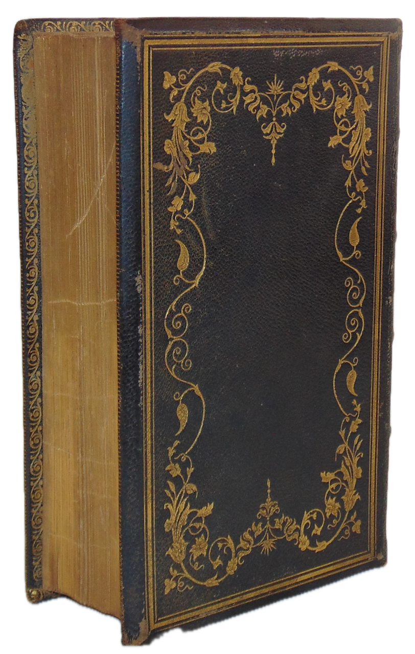 Black morocco with gilt borders & designs to front & back covers, 5 panels in gilt with raised bands to spine, board edges in gilt, joints fine, 7 1/2 x 4 3/4 inches. All page edges gilt. Small ticket of S. R. Gray, Bookseller and Stationer, No. 38 State St., Albany, N. Y., inside the front cover. Yellow waxed end papers; front free end paper missing. 866, 94 clean pp., tight. Very good. Hardcover.