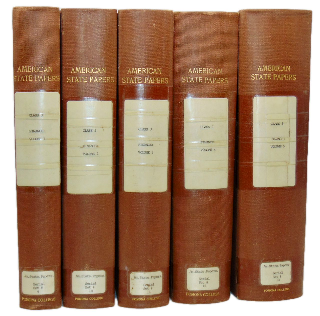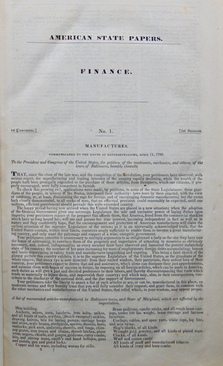 Lowrie, Walter; Clark, Matthew St. Clair; et al. American State Papers. Finances (5 volumes) Class 3, Vols. 1-5. Documents of the Legislative and Executive, of the Congress of the United States...&c. Washington: Gales and Seaton, 1833-1859. First Editions. [11609]