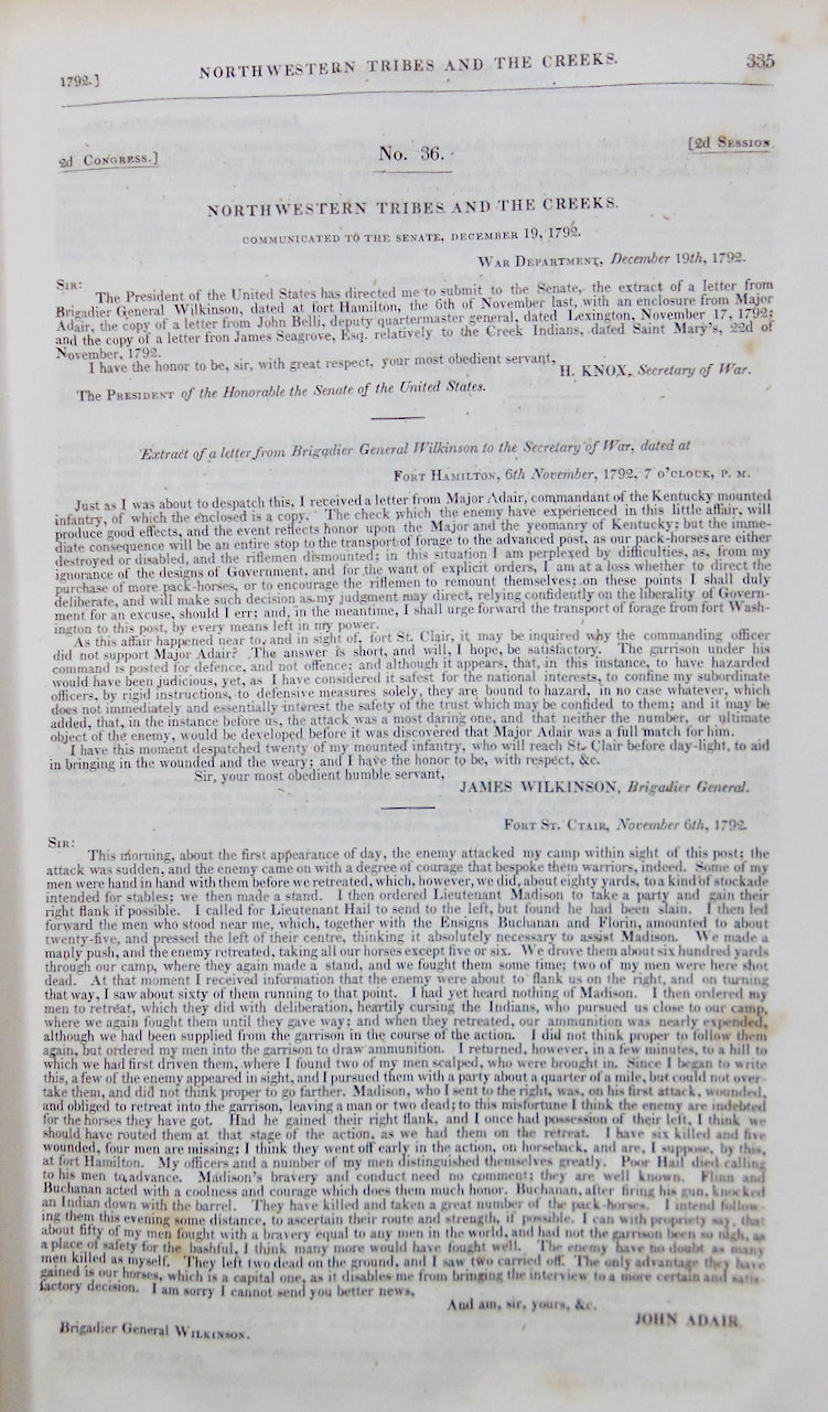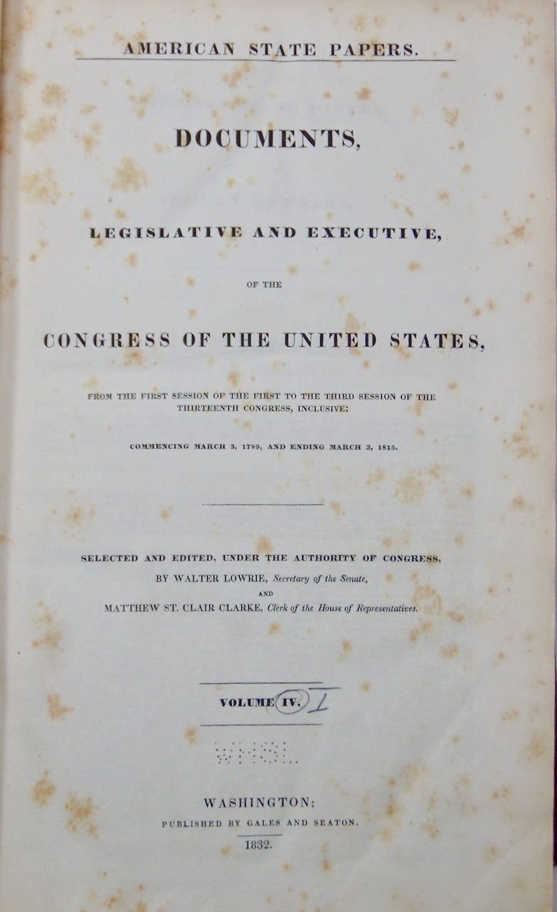 Lowrie, Walter; Clark, Matthew St. Clair. American State Papers. Indian Affairs (2 volumes) Class 2, Vols. 1-2. Documents of the Legislative and Executive, of the Congress of the United States...&c. Washington: Gales and Seaton, 1832-1834. [11597]