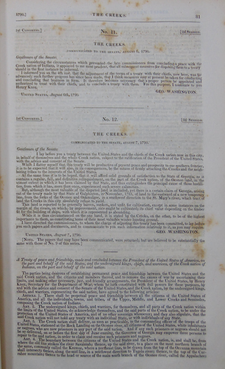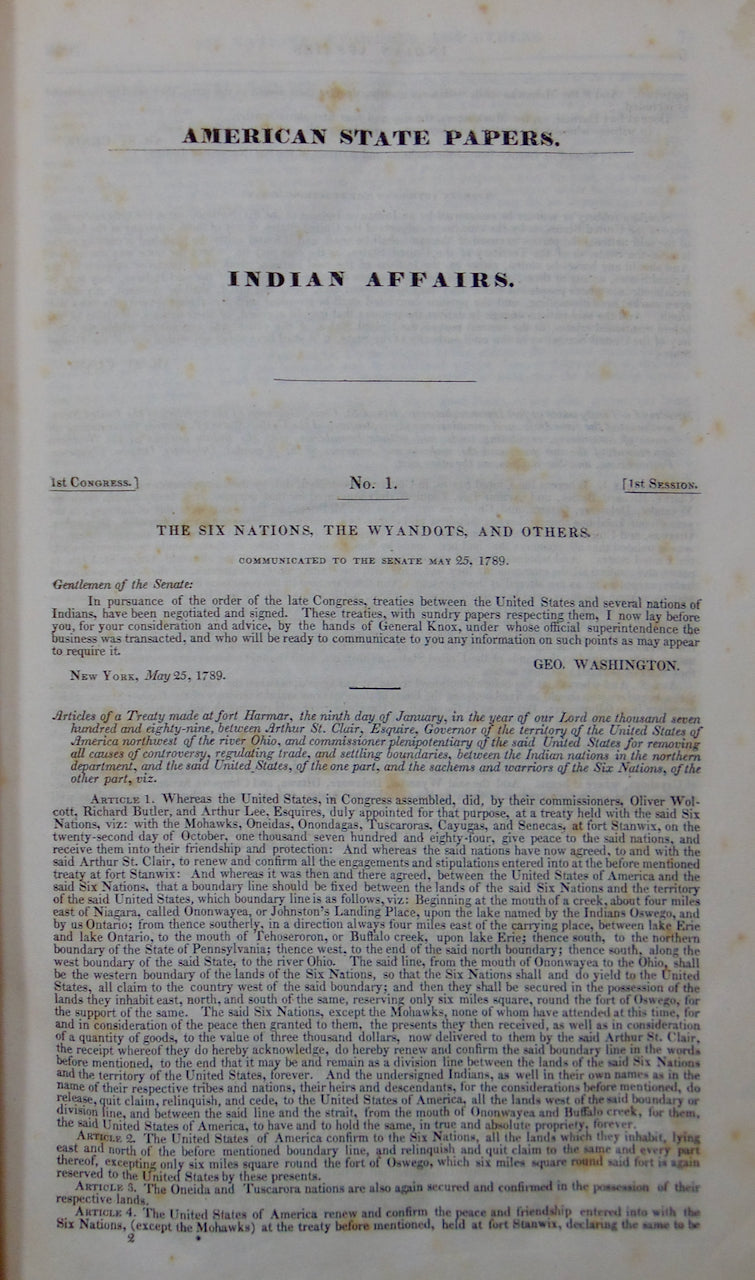 These two volumes cover the years 1789 to 1827, and includes all of the documents pertaining to Indian tribes in connection with the government of the United States. They begin with the treaty with the Six Nations, Wyandots, and others, of 1789, presented to the Congress by President George Washington. The last Treaty is with the Creeks in 1825.