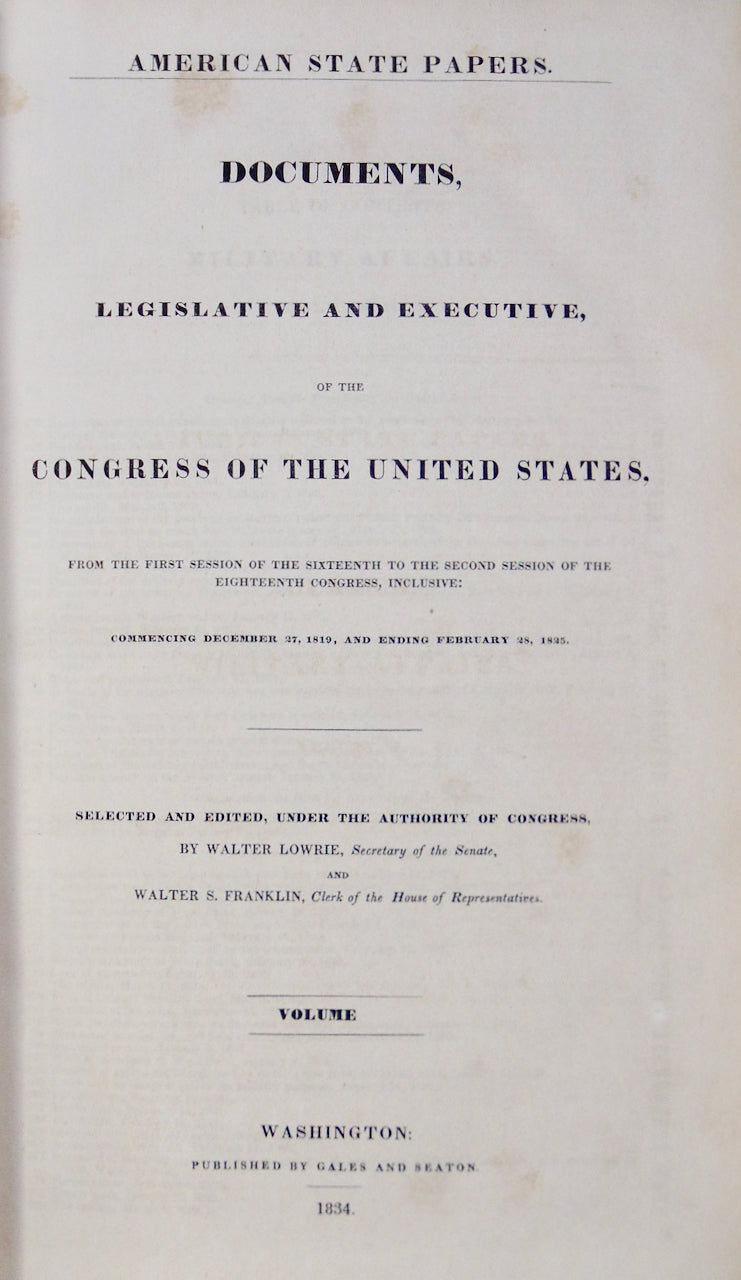 Lowrie, Walter; Clark, Matthew St. Clair; et al. American State Papers. Military Affairs. Class 5, Vol. 2. Documents of the Legislative and Executive, of the Congress of the United States...&c. Washington: Gales and Seaton, 1834. First Edition. [11601]