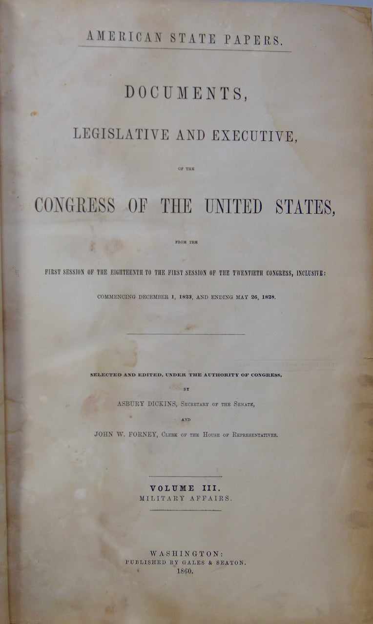 Dickins, Asbury; Forney, John W. American State Papers. Military Affairs. Class 5, Vol. 3. Documents of the Legislative and Executive, of the Congress of the United States...&c. Washington: Gales and Seaton, 1860. First Edition. [11602]
