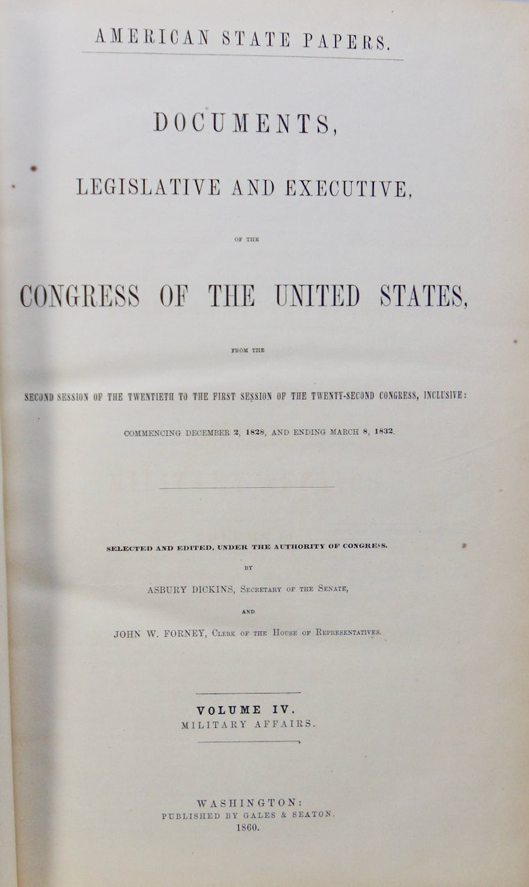 Dickins, Asbury; Forney, John W. American State Papers. Military Affairs. Class 5, Vol. 4. Documents of the Legislative and Executive, of the Congress of the United States...&c. Washington: Gales and Seaton, 1860. First Edition. [11603]