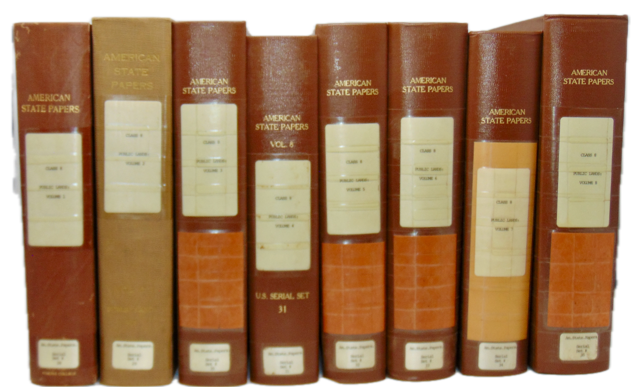 Lowrie, Walter; Clark, Matthew St. Clair; et al. American State Papers. Public Lands (8 volumes) Class 8, Vols. 1-8. Documents of the Legislative and Executive, of the Congress of the United States...&c. Washington: Gales and Seaton, 1832-1861. First Editions. [11599]