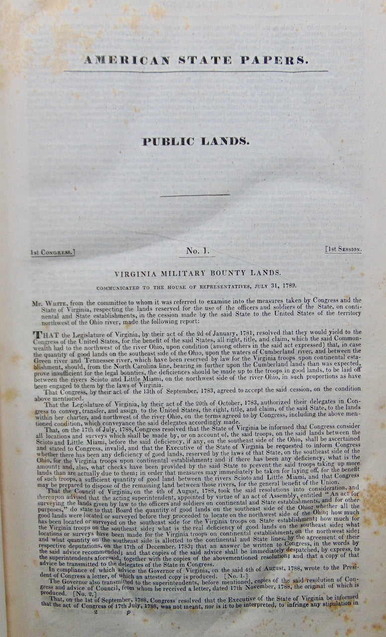 Vol. I. - Land Claims in the Northwest Territory; Virginia Military Bounty Lands; Indian Grants; Indiana territory; Land titles in Michigan Territory; Disputed Lands between New York and Massachusetts; Reservations in Ohio; Mississippi; Nachez; etc.