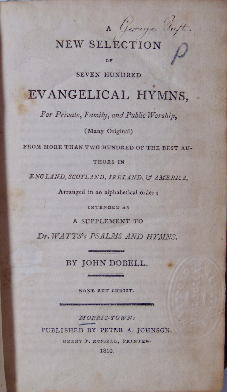 Dobell, John. A New Selection of Seven Hundred Evangelical Hymns, For Private, Family, and Public Worship, (Many Original) from more than two hundred of the best Authors in England, Scotland, Ireland, & America, Arranged in Alphabetical Order; Intended as a Supplement to Dr. Watts's Psalms and Hymns. Morris-Town, [N. J.]: Published by Peter A. Johnson. Henry P. Russell, Printer, 1810. First American Edition. [11309]