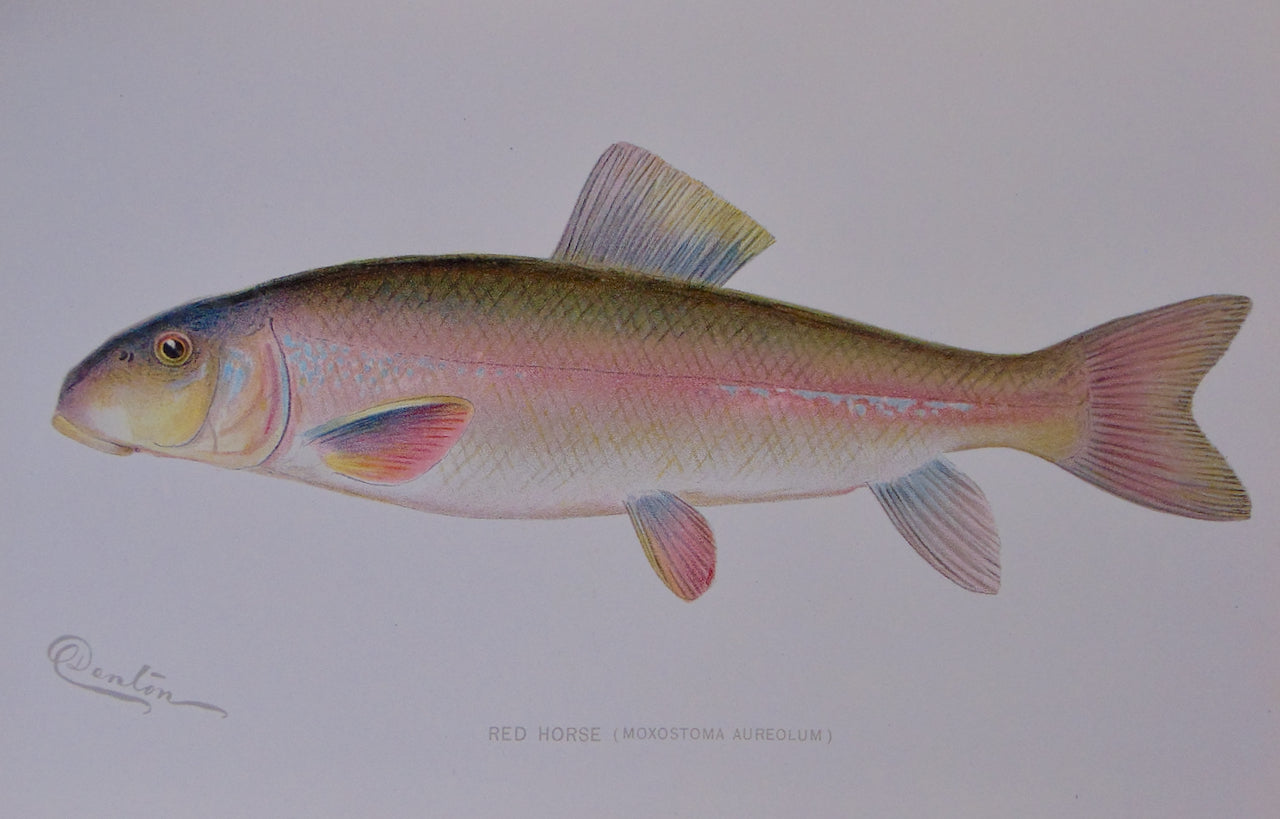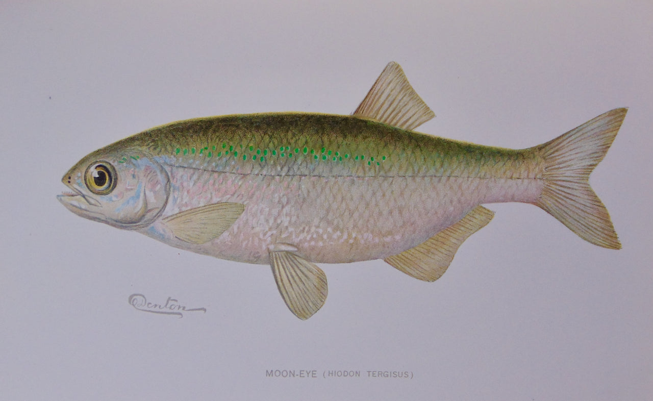 Light green cloth with black borders, spine titles in gilt, front board decorated in black and copper, 11 1/4 x 8 1/2 inches, tight. Black & white patterns on end papers. 456 clean pages plus plates and large folding map. List of contents below. One of the bird plates is detached and laid in; one bird plate is missing (Blackburnian Warbler) with 16 of 17 present. All nine Denton fish plates are present and in very good clean condition. Good. Hardcover.