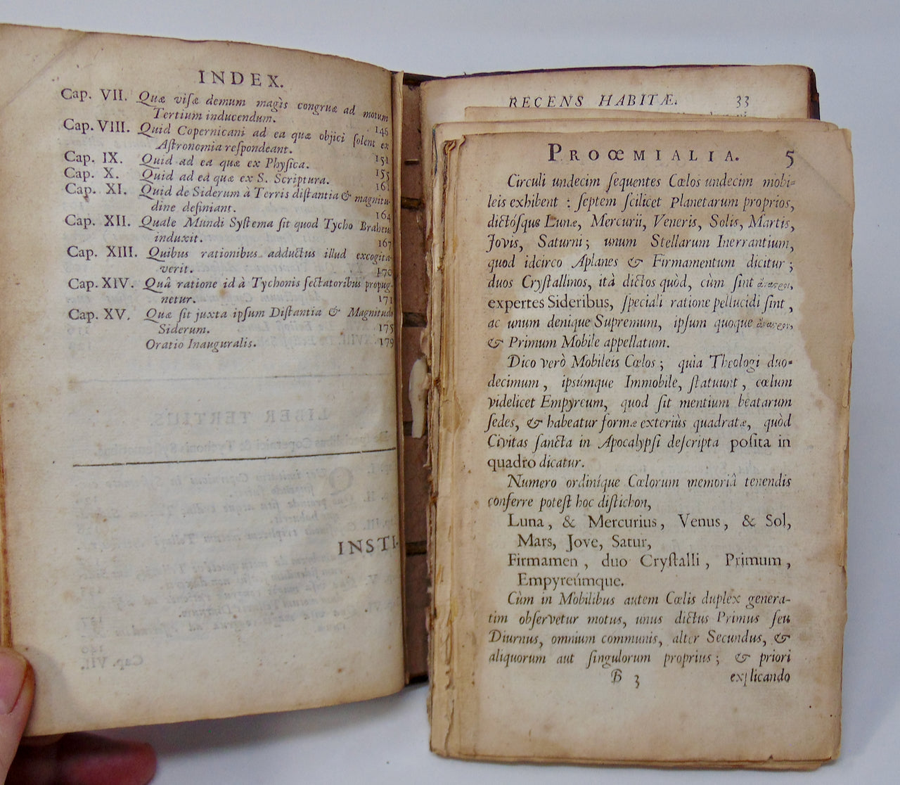 Full leather, sometime rebacked in calf, binding itself is good but the text block is now separated and in several pieces, with missing leaves (details to follow). 18.6 x 11.5 cm (7 1/4 x 4 1/2 inches). Title page in red & black. Contents are defective: [i-xiv], 5-6, 11-78, 81-114, 117-199, [1], with many text illustrations. Followed by Sidereus Nuncius, Magna Longeque…&c. By Galileo & Kepler’s Mathematici Dioptrice, no place, 1682. Galileo: [i-ii], 3-16, 19-50. Kepler: [51-52], 53-172 (of 173). A defective copy, lacking 4 unnumbered pages of plates; 4 pp. preliminaries and 8 pp. of text in the first part and 3 pp, of text in the second part.