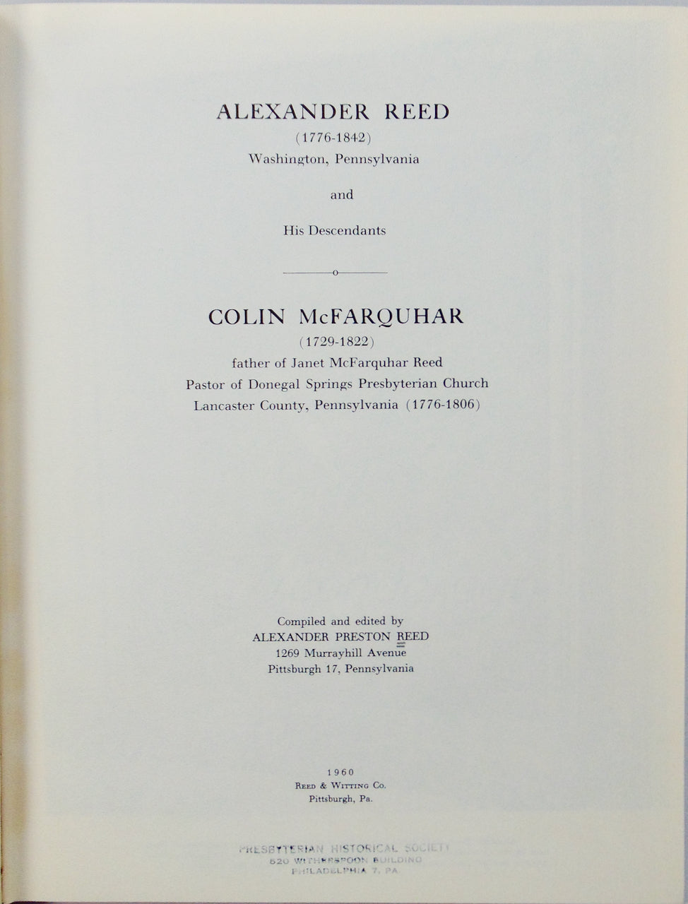 Reed, Alexander Preston. Alexander Reed (1776-1842) Washington, Pennsylvania and His Descendants | Colin McFarquhar (1729-1822) father of Janet McFarquhar Reed, Pastor of Donegal Springs Presbyterian Church, Lancaster County, Pennsylvania (1776-1806). Pittsburgh, Pa.: Reed & Witting Co., 1960. [7730]