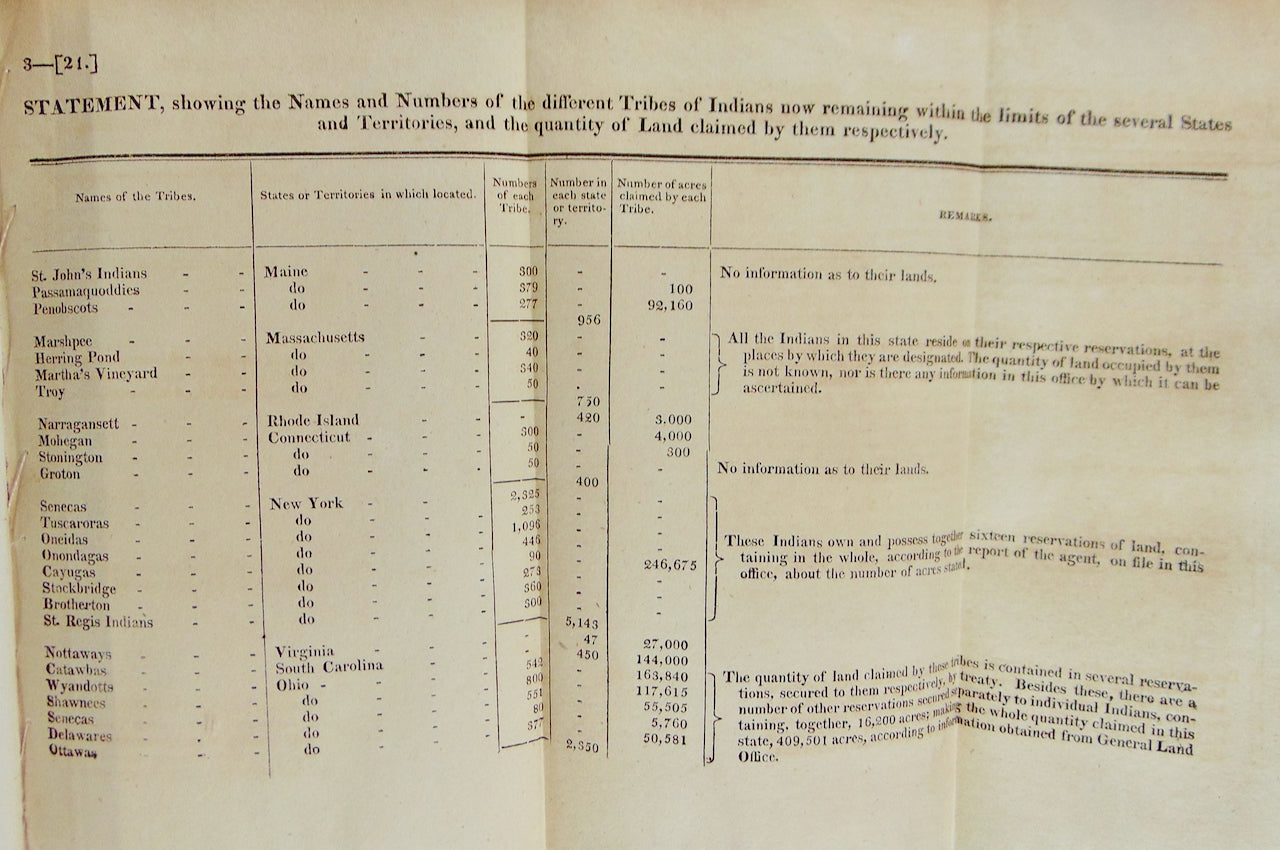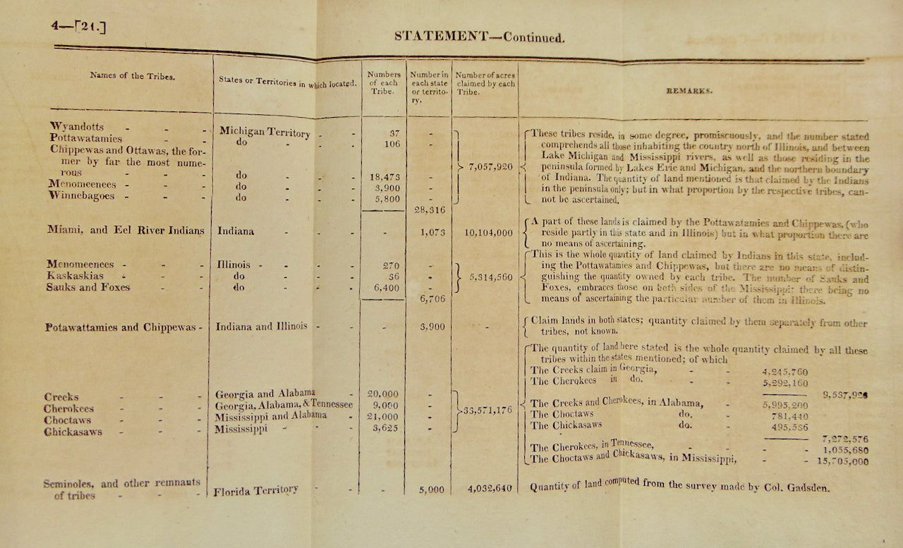 A report containing "the names of the Indian tribes now remaining within the limits of the different states and territories, the number of each tribe, and the quantity of land claimed by each; also, an estimate of the amount of appropriation necessary to commence the work of moving the Indians beyond the Mississippi...I herewith enclose a report from Colonel M'Kenney, to whom is assigned the charge of the office of Indian affairs, which contains all the necessary information required, except the estimate of the sum necessary to be appropriated to commence the removal."