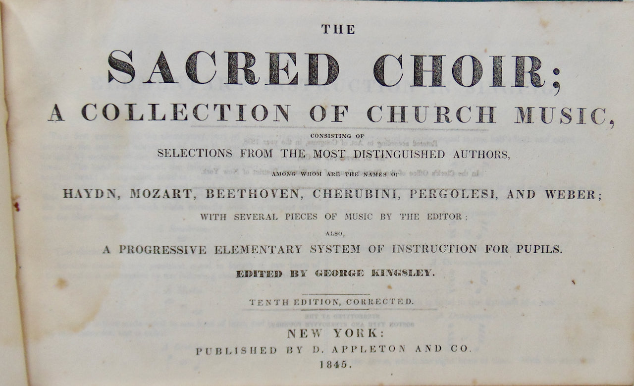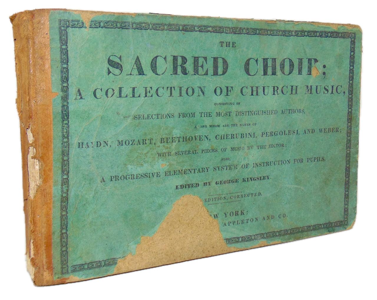 Kingsley, George. The Sacred Choir; A Collection of Church Music, consisting of Selections from the most distinguished Authors, among whom are the names of Hayden, Mozart, Beethoven, Cherubini, Pergolesi, and Weber; with several pieces of music by the Editor; also, A Progressive Elementary System of Instruction for Pupils. New York: D. Appleton and Co., 1845. Tenth Edition, Corrected. [11481]