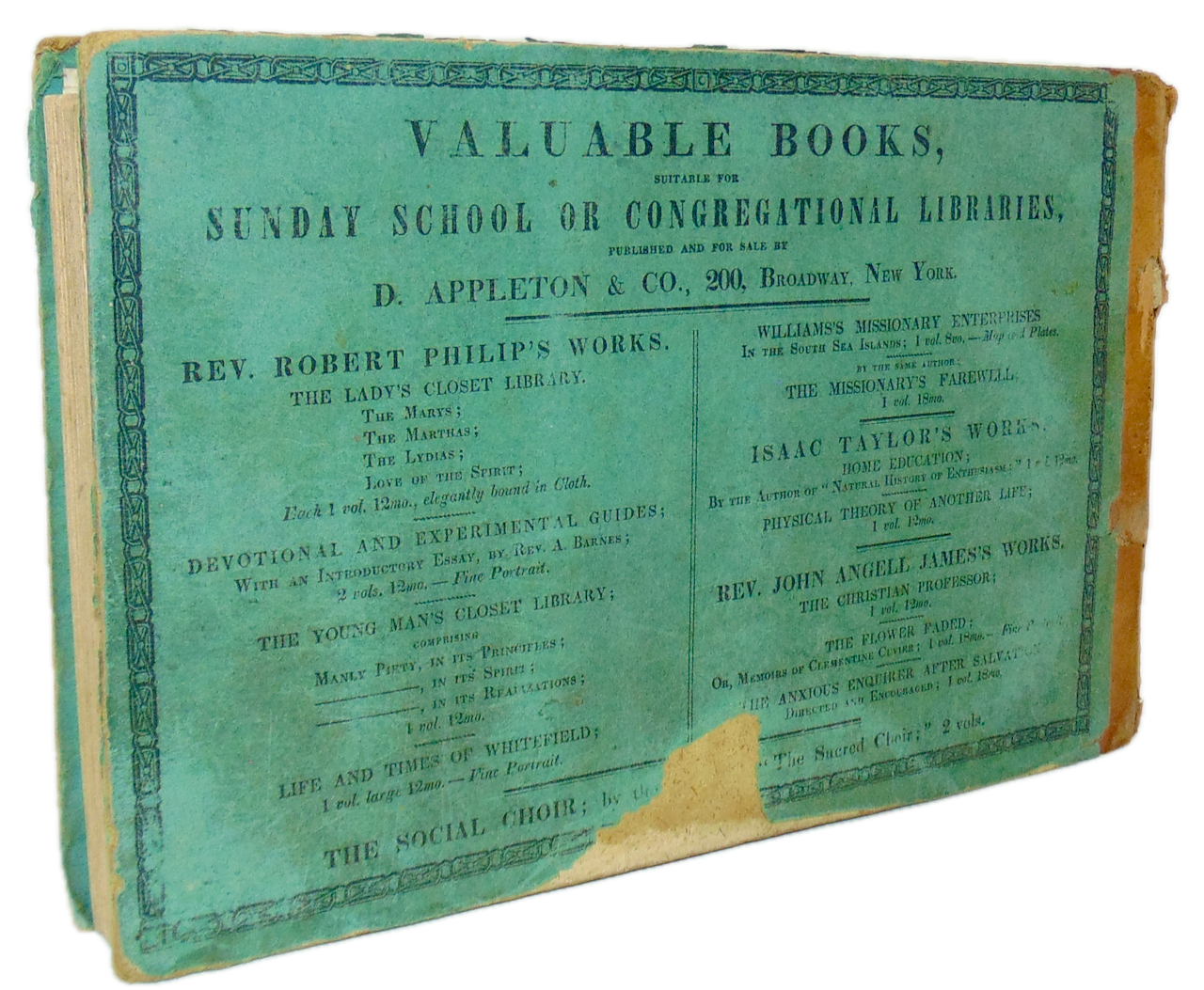 Brown leather spine with green printed paper over card, paper torn with loss on front cover, smaller portion of loss on back board, edges worn, spine leather worn with loss, oblong 6 1/4 x 9 3/4 inches. 342 generally clean pp., some foxing. Fair. Hardcover.