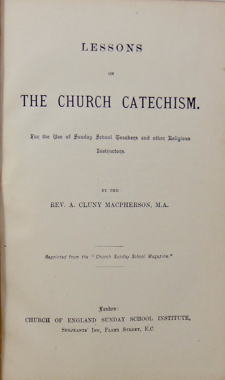 MacPherson, A. Cluny. Lessons on The Church Catechism : For the Use of Sunday School Teachers and other Religious Instructors. London: Church of England Sunday School Institute, ca. 1880. [11526]