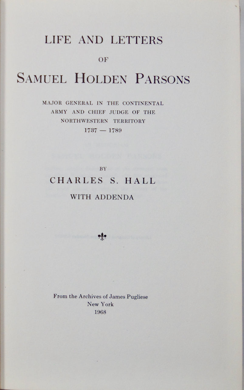 Hall, Charles S. Life and Letters of Samuel Holden Parsons, Major General in the Continental Army and Chief Judge of the Northwestern Territory, 1737-1789. New York: From the Archives of James Pugliese, 1968. Reprint edition. [11748]