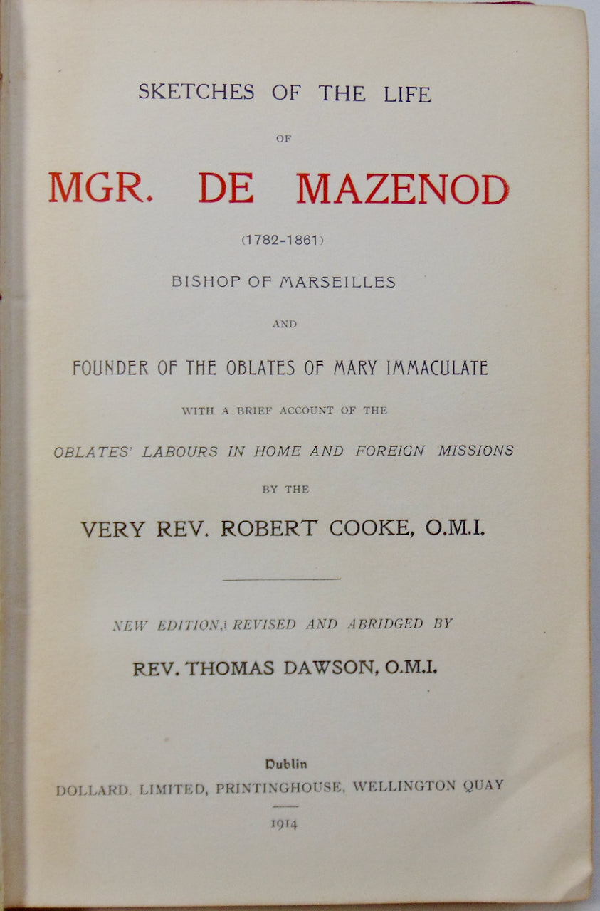 Cooke, Robert. Sketches of the Life of Mgr. de Mazenod (1782-1867) Bishop of Marseilles and Founder of the Oblates of Mary Immaculate, with a brief account of the Oblates' Labours in Home and Foreign Missions; New Edition, Revised and Abridged by Re. Thomas Dawson, O.M.I. Dublin: Dollard, Limited, Printinghouse, 1914. Revised Edition. [11517]