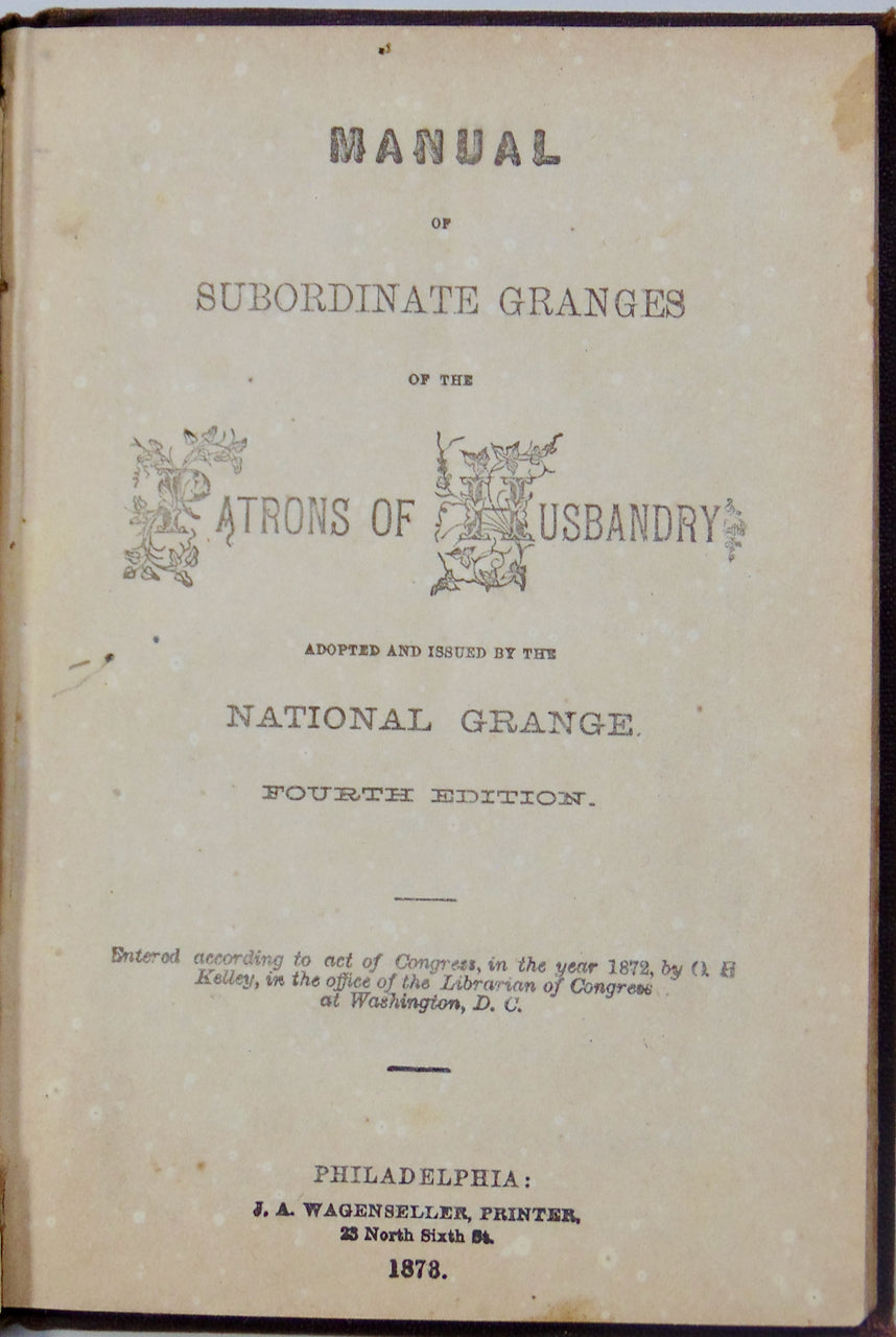 Manual of Subordinate Granges of the Patrons of Husbandry adopted and issued by the National Grange. Philadelphia: J. A. Wagenseller, 1873. Fourth Edition. [11717]