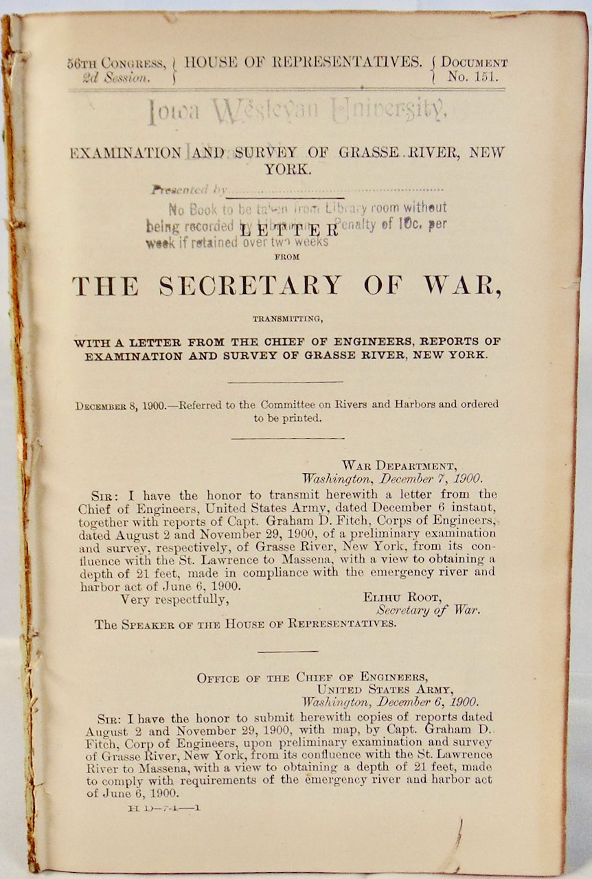Root, Elihu; Wilson, John M.; et al. [MAP] Examination and Survey of Grasse River, New York. 56th Congress, House of Representatives, Document No. 151. Washington DC: Government Printing Office, 1900. First Edition. [11775]