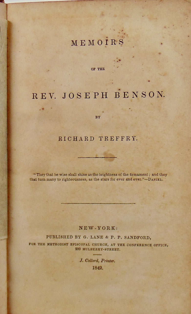 Treffry, Richard. Memoirs of the Rev. Joseph Benson. New-York: Published by G. Lane & P. P. Sandford, for the Methodist Episcopal Church, at the Conference Office, 200 Mulberry-street. J. Collord, Printer, 1842. [11840]
