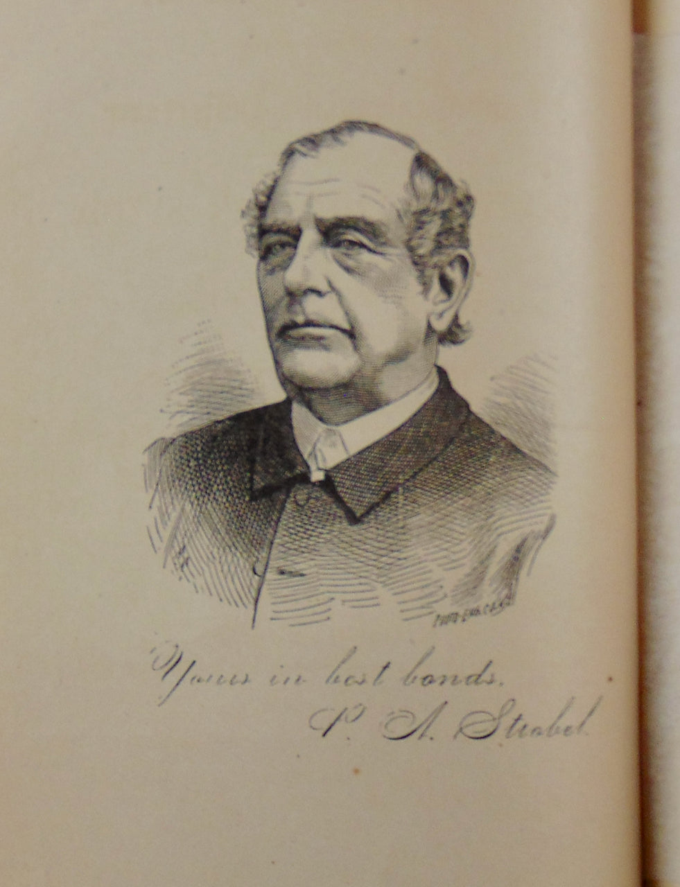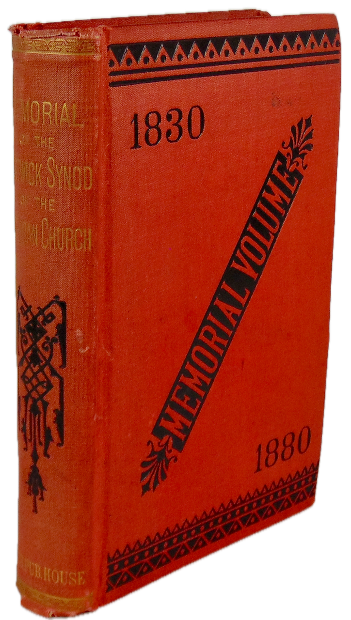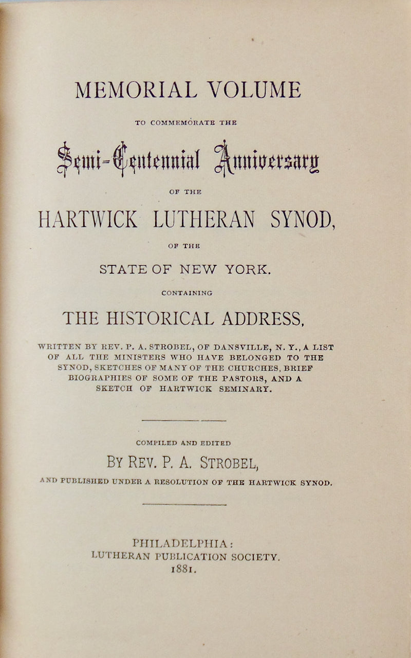 Strobel, P. A. Memorial Volume to Commemorate the Semi-Centennial Anniversary of the Hartwick Lutheran Synod, of the State of New York. Containing The Historical Address, written by the Rev. P. A. Strobel, of Dansville, N. Y., A List of all the Ministers who have belonged to the Synod, Sketches of many of the Churches, Brief Biographies of some of the Pastors, and a Sketch of Hartwick Seminary. Philadelphia: Lutheran Publication Society, 1881. First Edition. [11821]