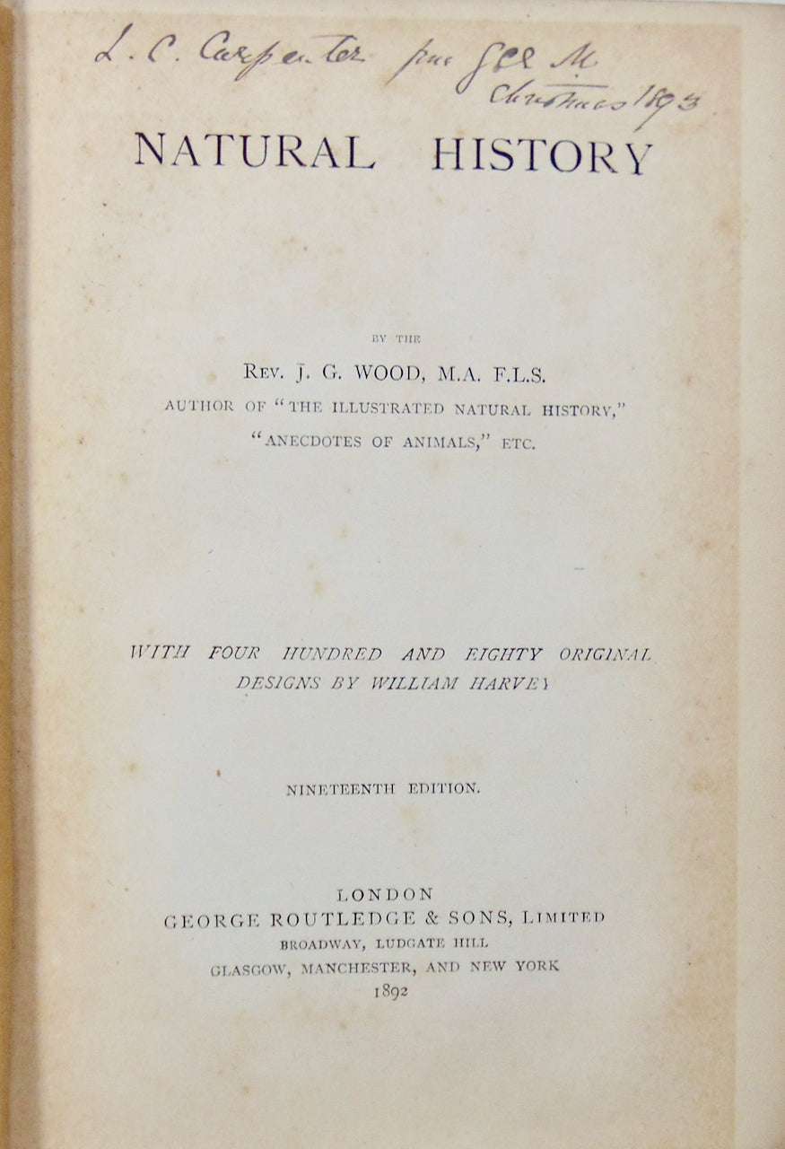 Rev. John George Wood (1827-1889), b. London, England; d. Coventry, England. Rev. Wood was educated at Oxford University and was ordained in the Anglican Church, serving several parishes and chaplaincies. He became the best-known writer and lecturer on natural history of his time, and wrote many books and essays on the subject.