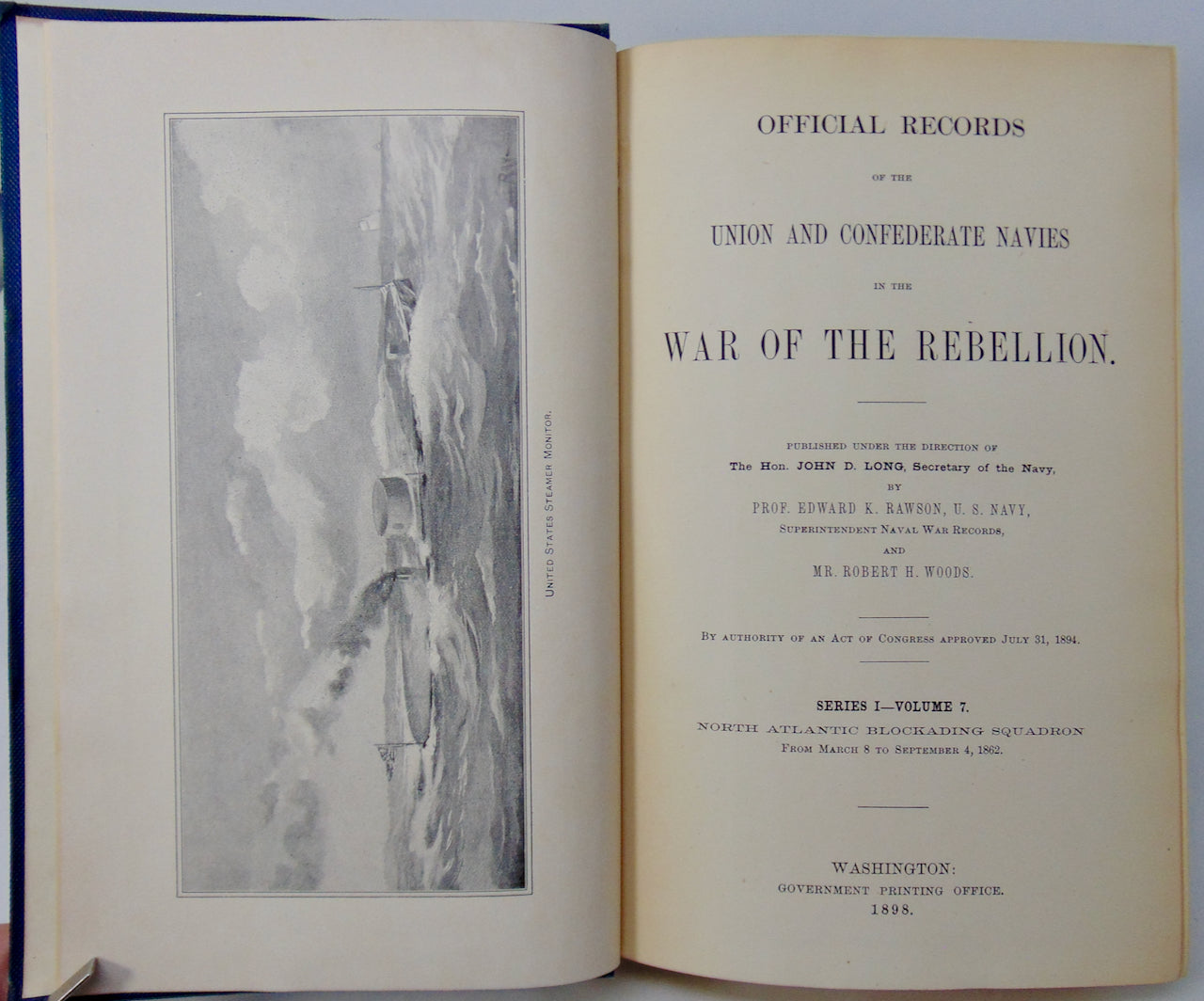Rawson, Edward K.; Woods, Robert H. Official Records of the Union and Confederate Navies in the War of the Rebellion. Series I - Volume 7. North Atlantic Blockading Squadron, From March 8 to September 4, 1862. Washington DC: Government Printing Office, 1898. First Edition. [11292]