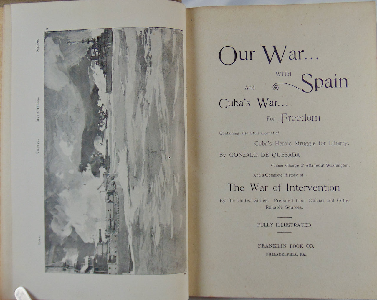 De Quesada, Gonzalo. Our War with Spain and Cuba's War for Freedom. Containing also a full account of Cuba's Heroic Struggle for Liberty. And a Complete History of The War of Intervention by the United States. Prepared from Official and Other Reliable Sources. Fully Illustrated. Philadelphia: Franklin Book Co., 1896 & 1898. [11827]