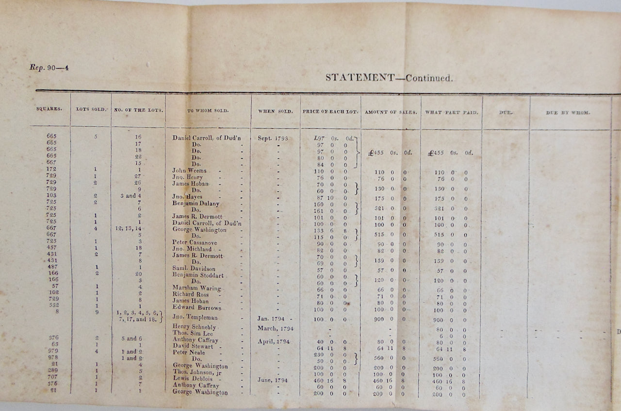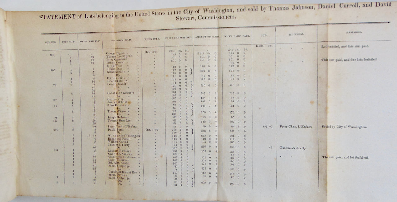 Records of the sale of lands in Washington City (Washington, DC), beginning in 1791. There was concern that the person in charge of the sales had not kept good records, and this report was intended to find out if he owed the government any money. What it presents to us in minute detail is all of the sales of the lots making up the new Washington City, who owned each plot, and what was paid for it. Also included are record of the lots sold to the US Government for US Government buildings.