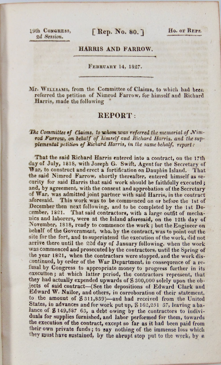 US House of Representatives. Reports of Committees, 2nd Session, 19th Congress, 1827. Washington: Printed by Gales & Seaton, 1827. First Edition. [11682]