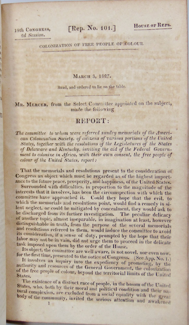 Colonization of Free People of Color (A study on the feasibility of planting a colony of free American blacks in Africa, 95 pp. Includes 2 page list of "Vessels engaged in the slave trade," with name, type of vessel, and country of origin.
