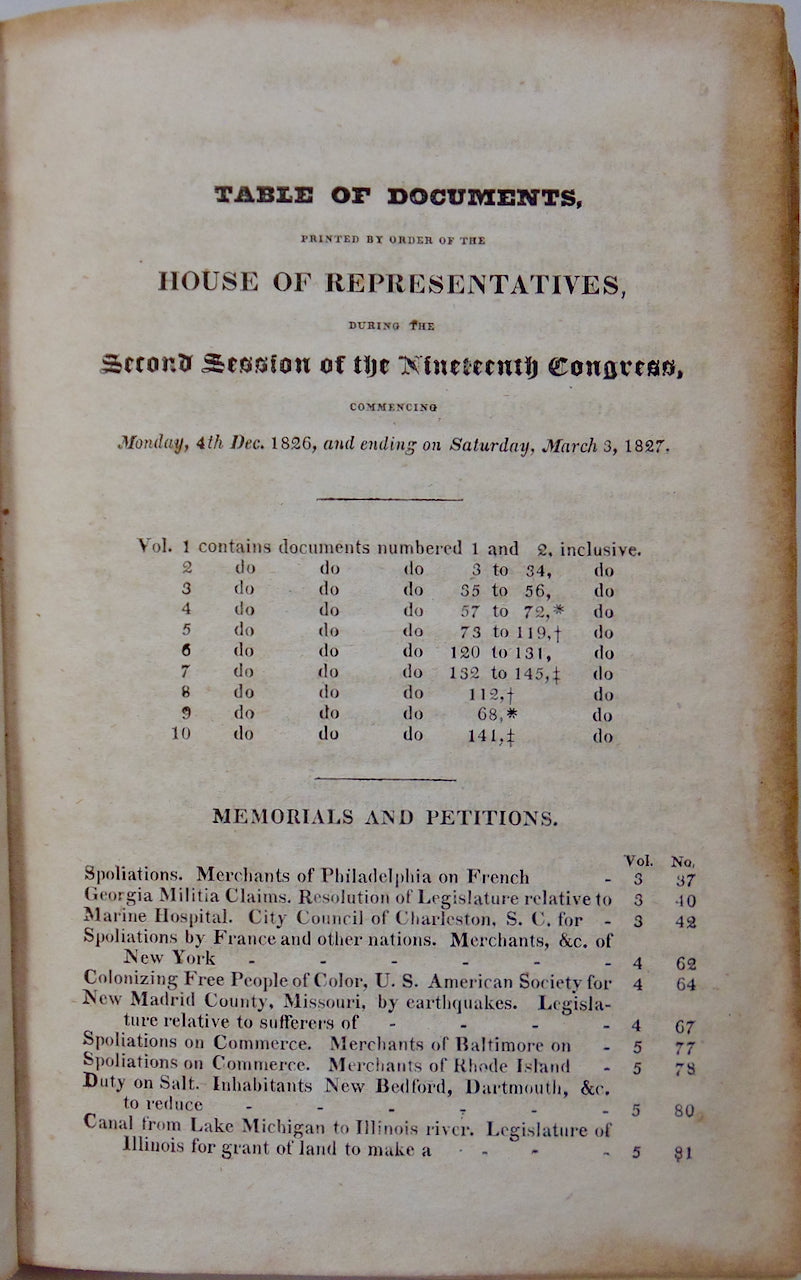 US House of Representatives. State Papers, 2nd Session, 19th Congress, 1827. Washington: Printed by Gales & Seaton, 1827. First Edition. [11683]