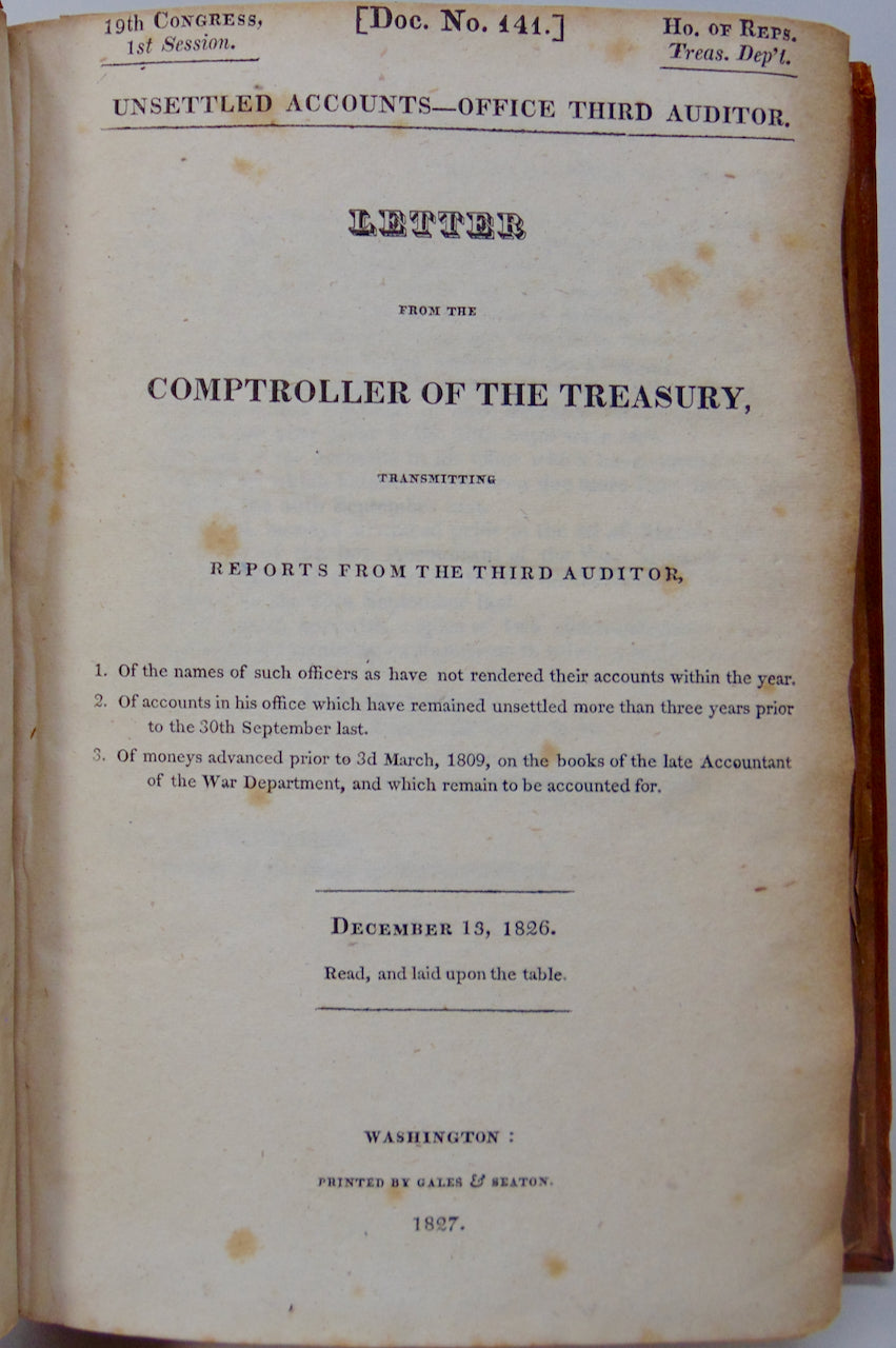 US House of Representatives. State Papers, 2nd Session, 19th Congress, 1827 Report 141 Unsettled Accounts - Office Third Auditor. Washington: Printed by Gales & Seaton, 1827. First Edition. [11684]