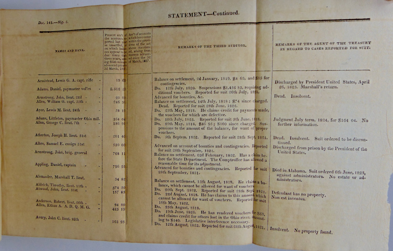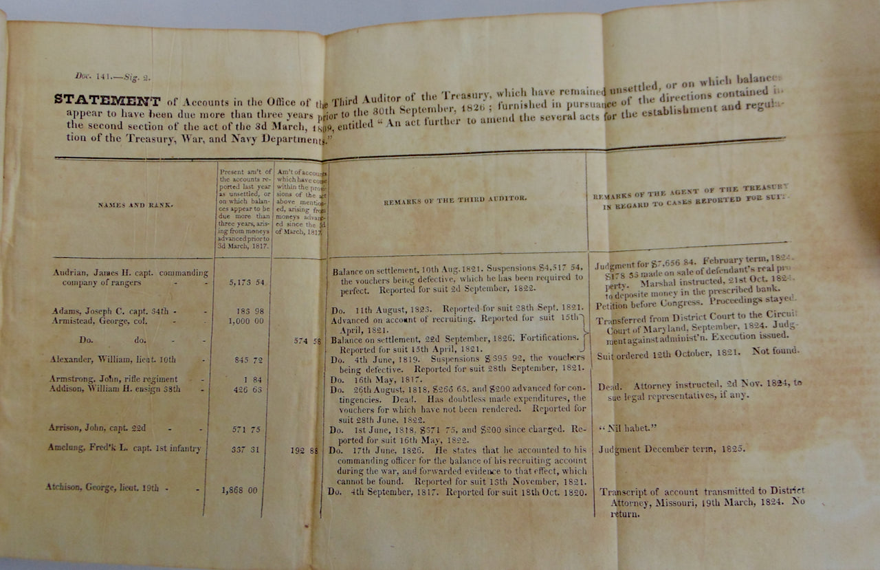There are 98 folding charts in this volume, and the ones that I have looked at have the date 1817 for the beginning of the record. The charts list alphabetically the names of officers in US military service, with their rank & regiment, and moneys due or unsettled. Many of the officers had received an advance on pay and owed a portion of it back to the government. If we had the time I think these folding plates would sell individually, but, alas, we have hundreds of these volumes and lack the time. An opportunity for you!