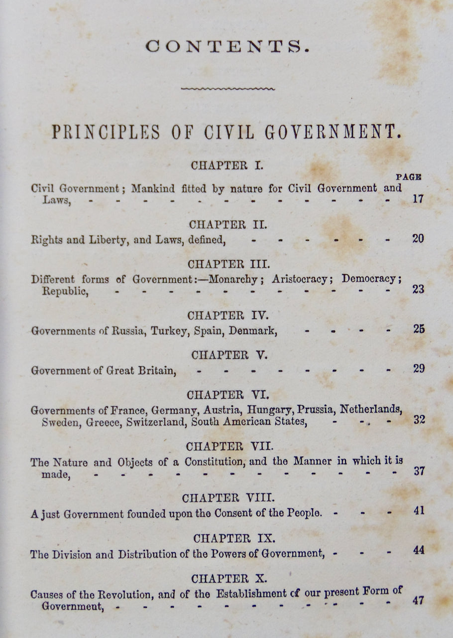 A school text for teaching the principles of the American government system. The author laments the lack of such knowledge and declares that our liberties depend upon everyone, male and female alike, being well-versed in the system of government bequeathed to them by their forefathers. Treats with all matters of law, from militias to marriages.