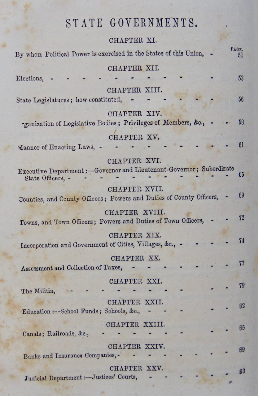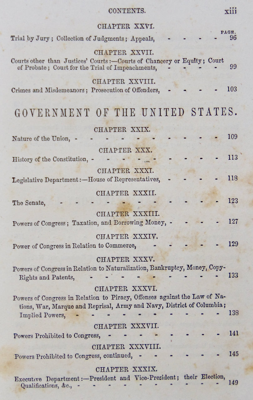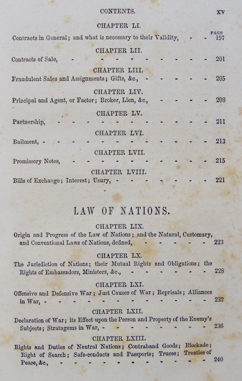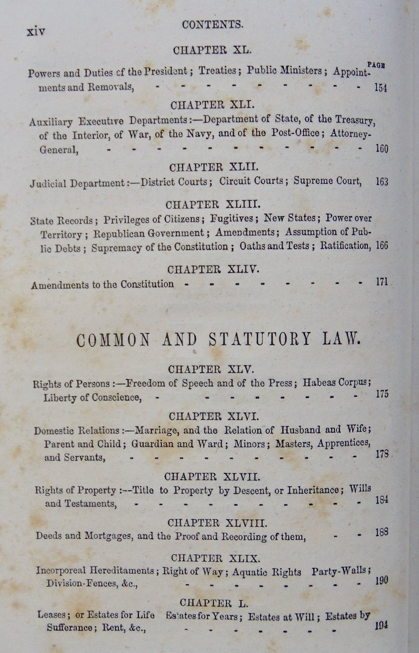 The author gives detailed accounts of both State and National laws and procedures, as well as a section on the Law of Nations. He gives a synopsis of each of the State constitutions, and relates distinguishing features of each, including each state's practice regarding slavery.