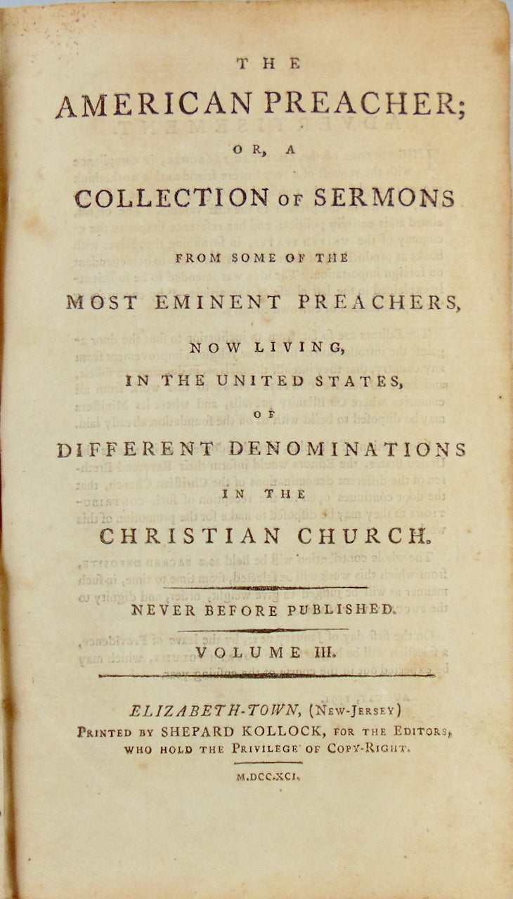 Witherspoon, John; Macwhorter, Alexander; et al. The American Preacher; or, A Collection of Sermons from some of the most eminent Preachers, now living, in the United States, of different Denominations in the Christian Church (Volume 3) Never before Published. Elizabeth-Town, (New-Jersey): Printed by Shepard Kollock, for the Editers, who hold the Privilege of Copy-Right, 1791. First Edition. [11777]