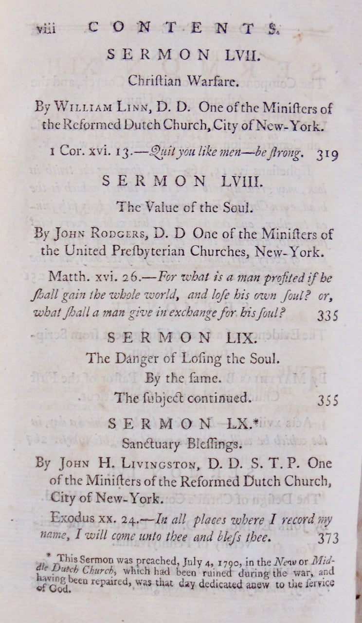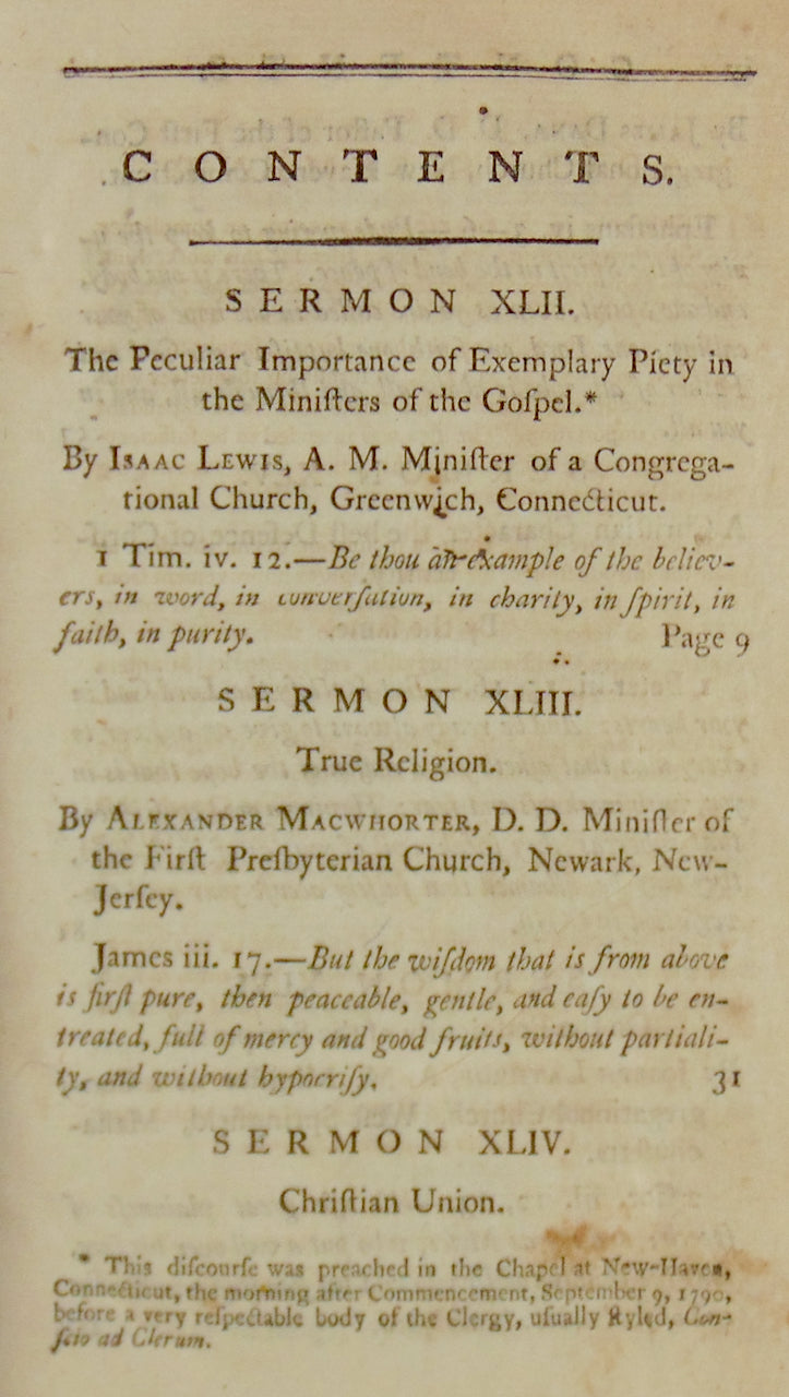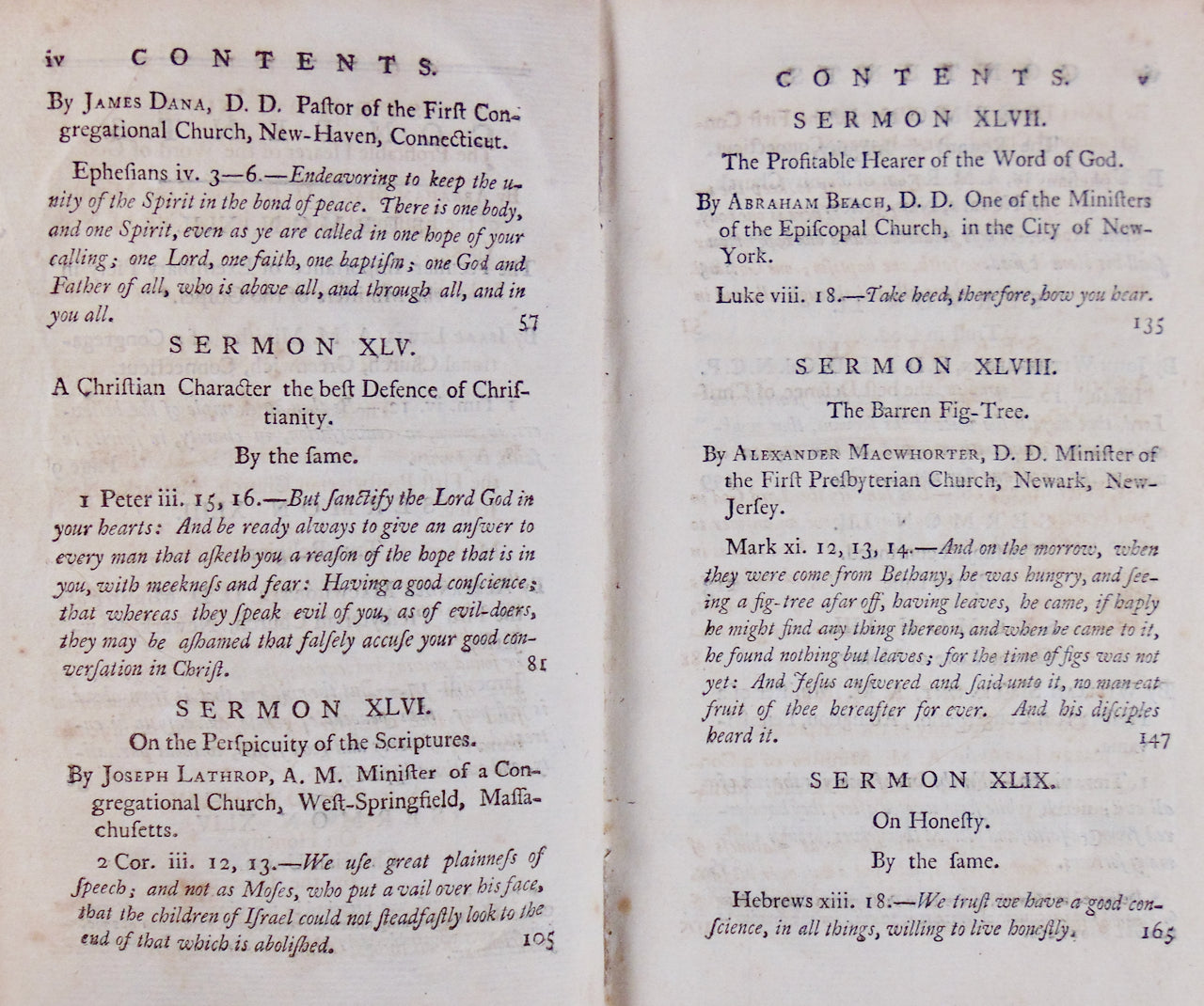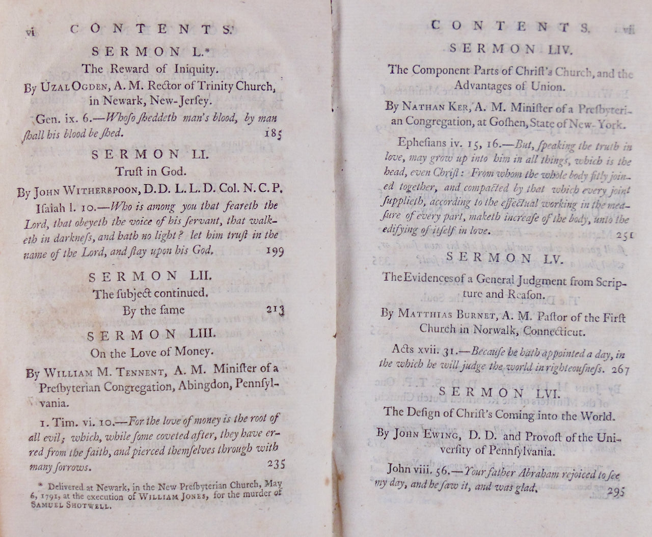 Twenty sermons preached by American ministers within a decade of the end of the American Revolution. The ministers are the Revs. Isaac Lewis, Alexander Macwhorter, James Dana, Joseph Lathrop, Abraham Beach, Uzal Ogden, John Witherspoon, William M. Tennent, Nathan Ker, Matthias Burnet, John Ewing, William Linn, John Rodgers, and John H. Livingstone. Four are by Macwhorter, two each by Rodgers, Dana, and Witherspoon.