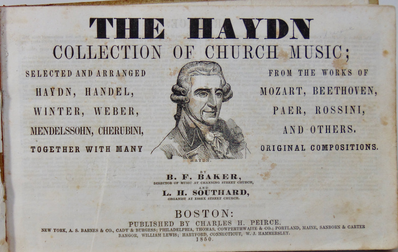 Baker, B. F.; Southard, L. H. The Haydn Collection of Church Music; selected and arranged from the works of Haydn, Handel, Mozart, Beethoven, Winter, Weber, Paer, Rossini, Mendelssohn, Cherubini, and others, together with many original compositions. Boston: Charles H. Pierce, 1850. [11328]