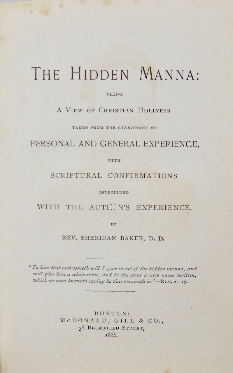 Baker, Sheridan. The Hidden Manna : being A View of Christian Holiness taken from the standpoint of Personal and General Experience, with Scriptural Confirmations introduced with the Author's Experience. Boston: McDonald, Gill & Co., 1888. [11715]