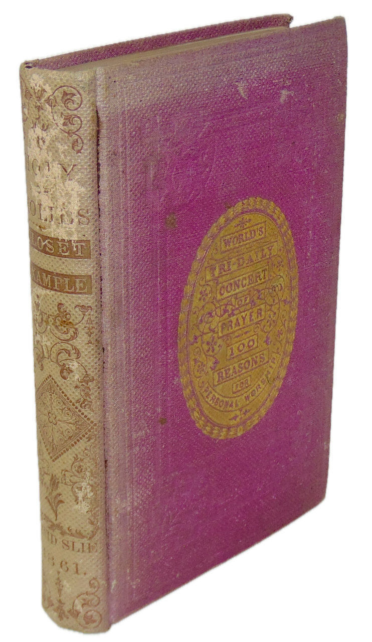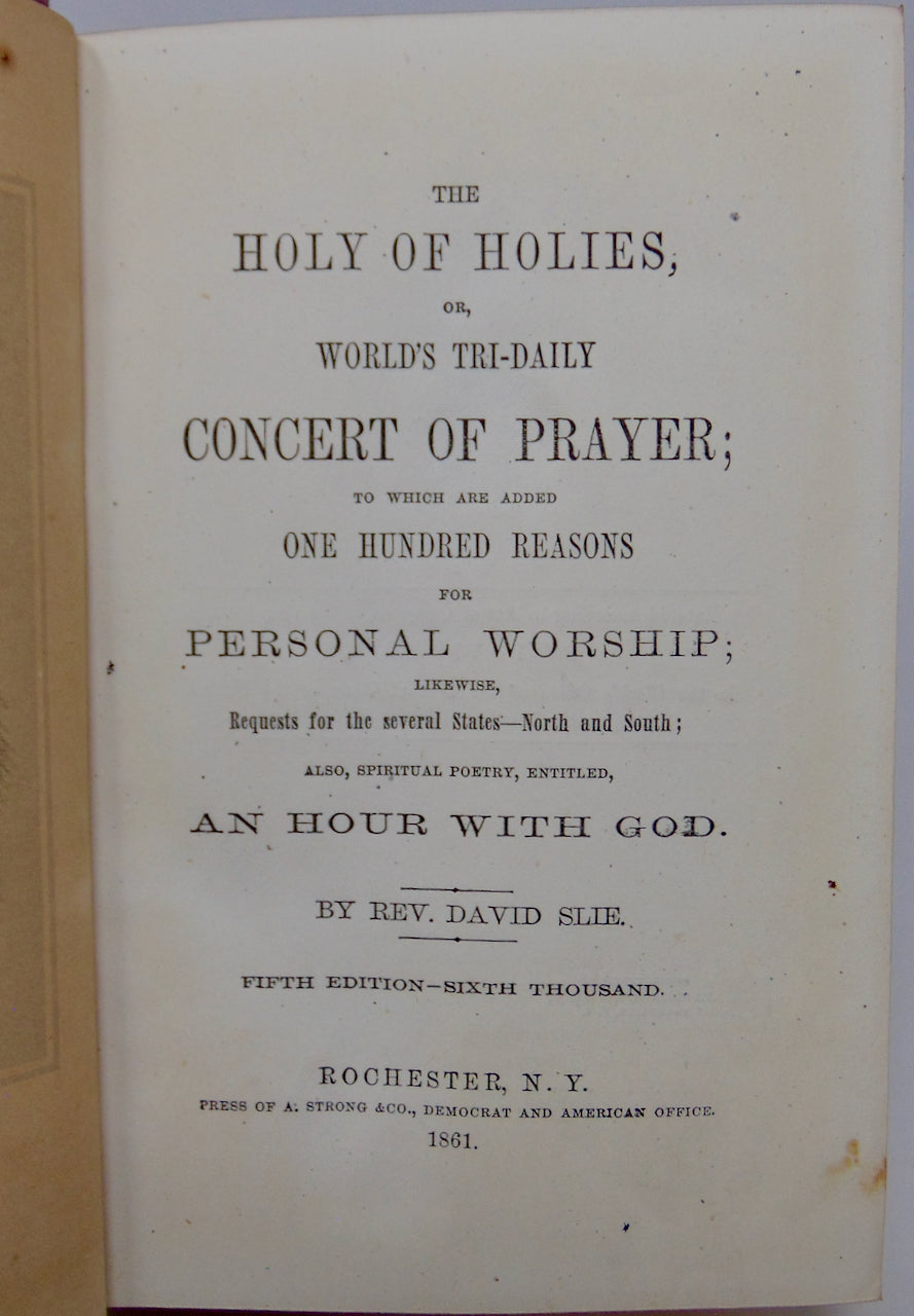 Slie, David. The Holy of Holies, or World's Tri-Daily Concert of Prayer; to which are added One Hundred Reasons for Personal Worship; likewise, Requests for the several States - North and South; Also, Spiritual Poetry, entitled, An Hour With God. Rochester, N. Y.: Press of A. Strong & Co., Democrat and American Office, 1861. Fifth Edition - Sixth Thousand. [10540]