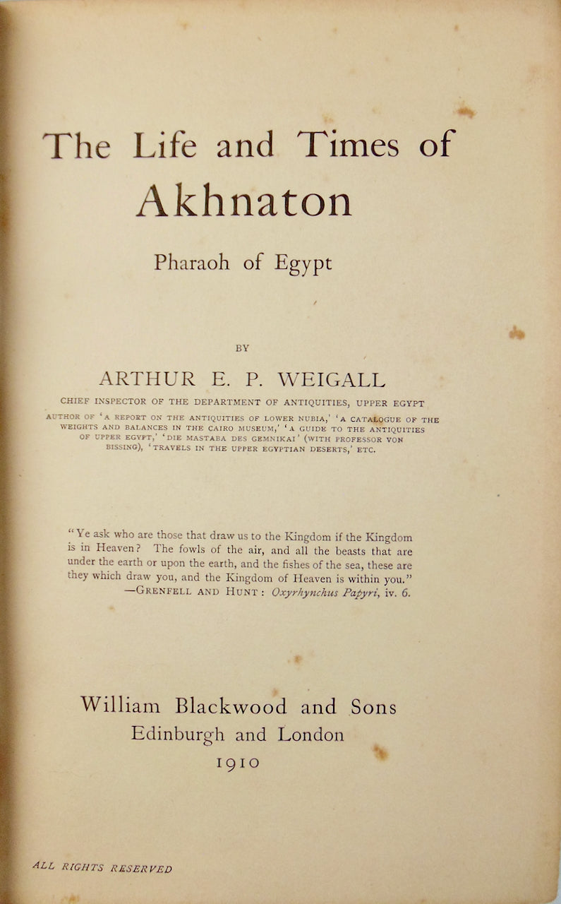 Weigall, Arthur E. P. The Life and Times of Akhnaton, Pharoah of Egypt. Edinburgh & London: William Blackwood and Sons, 1910. [11774]