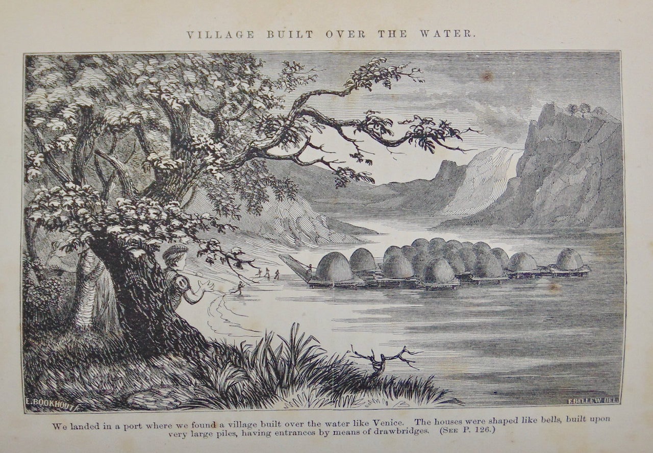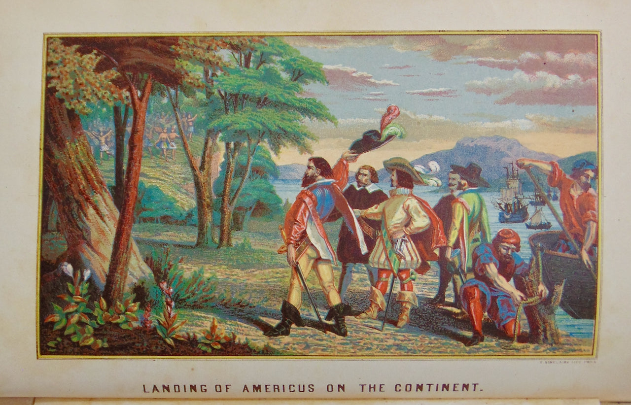 Black blind stamped cloth, spine in elaborate gilt, some edge-wear, dark blotch base of spine that is probably from a removed label, 9 1/4 x 6 1/2 inches, tight. Cream end papers, small name stamps of previous owner on same, engraved frontispiece of Vespucius by Charles Burt, [i]-xviii, [2], [21]-431, [1], [i]-vii pages. Colored lithograph, "Landing of Americus on the Continent;" 12 additional b/w wood-engraved plates; one folding chart of Vespucius' genealogy with 3" tear at the place it attaches to the book. Foxing throughout, light stain on some pages at the beginning of the book, including on the title page. Good. Hardcover.