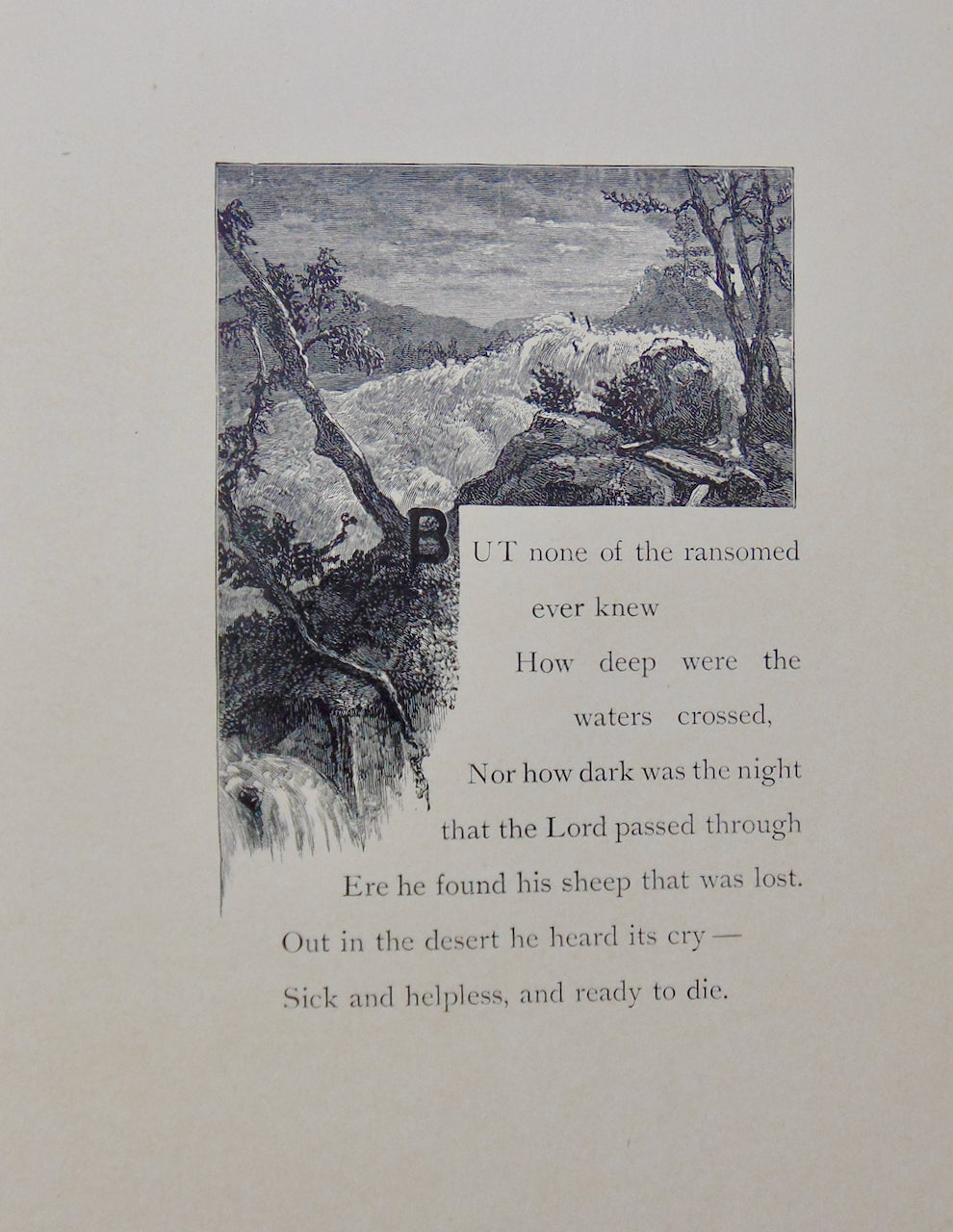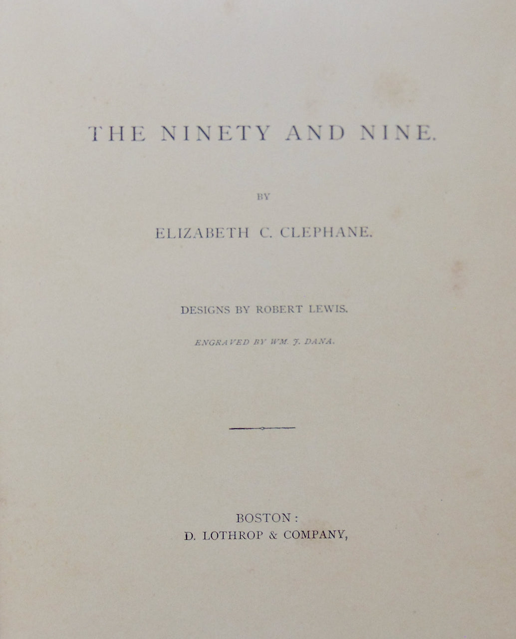 Clephane, Elizabeth C. The Ninety and Nine; Designs by Robert Lewis; Engraved by Wm. F. Dana. Boston: D. Lothrop & Company, (1877). First Edition. Gray cloth decorated in gilt & black, illustration of Jesus the Shepherd holding a lamb on the front cover, light soil to binding, 8 x 6 1/2 inches, all page edges gilt. Extra engraved title page, 34 pages of engravings/text on thick stock, engravings printed on one side only. Good. Hardcover.