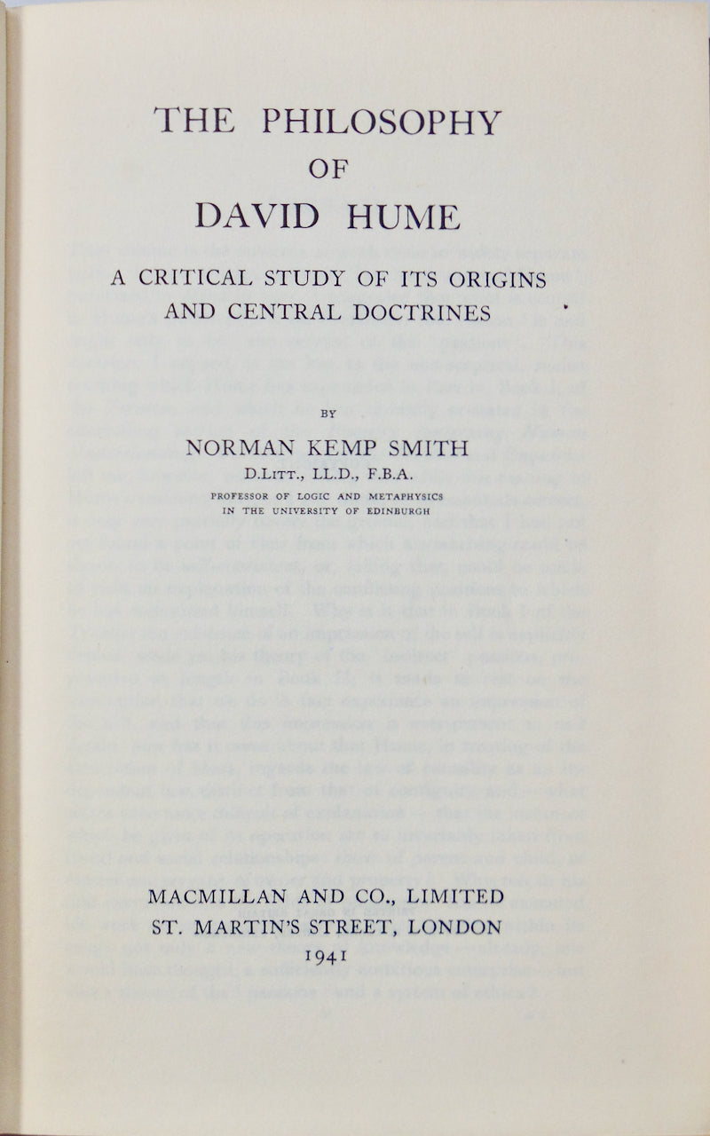 Smith, Norman Kemp. The Philosophy of David Hume : A Critical Study of its Origins and Central Doctrines. London: MacMillan and Co., 1941. First Edition. [11593]